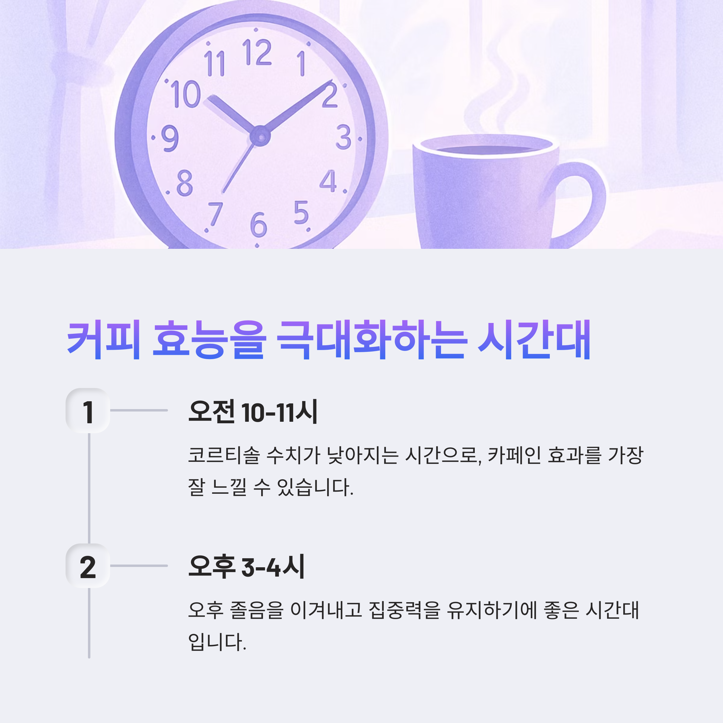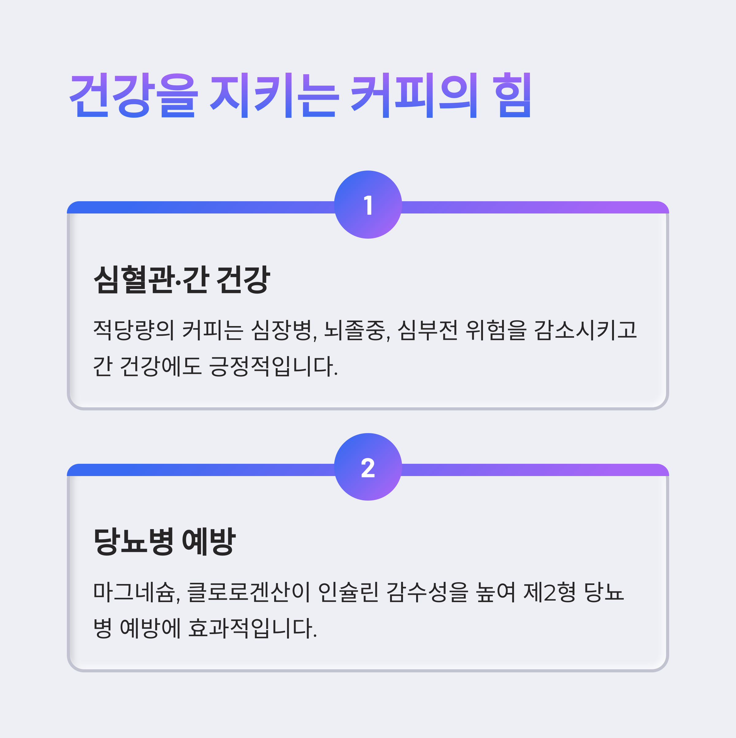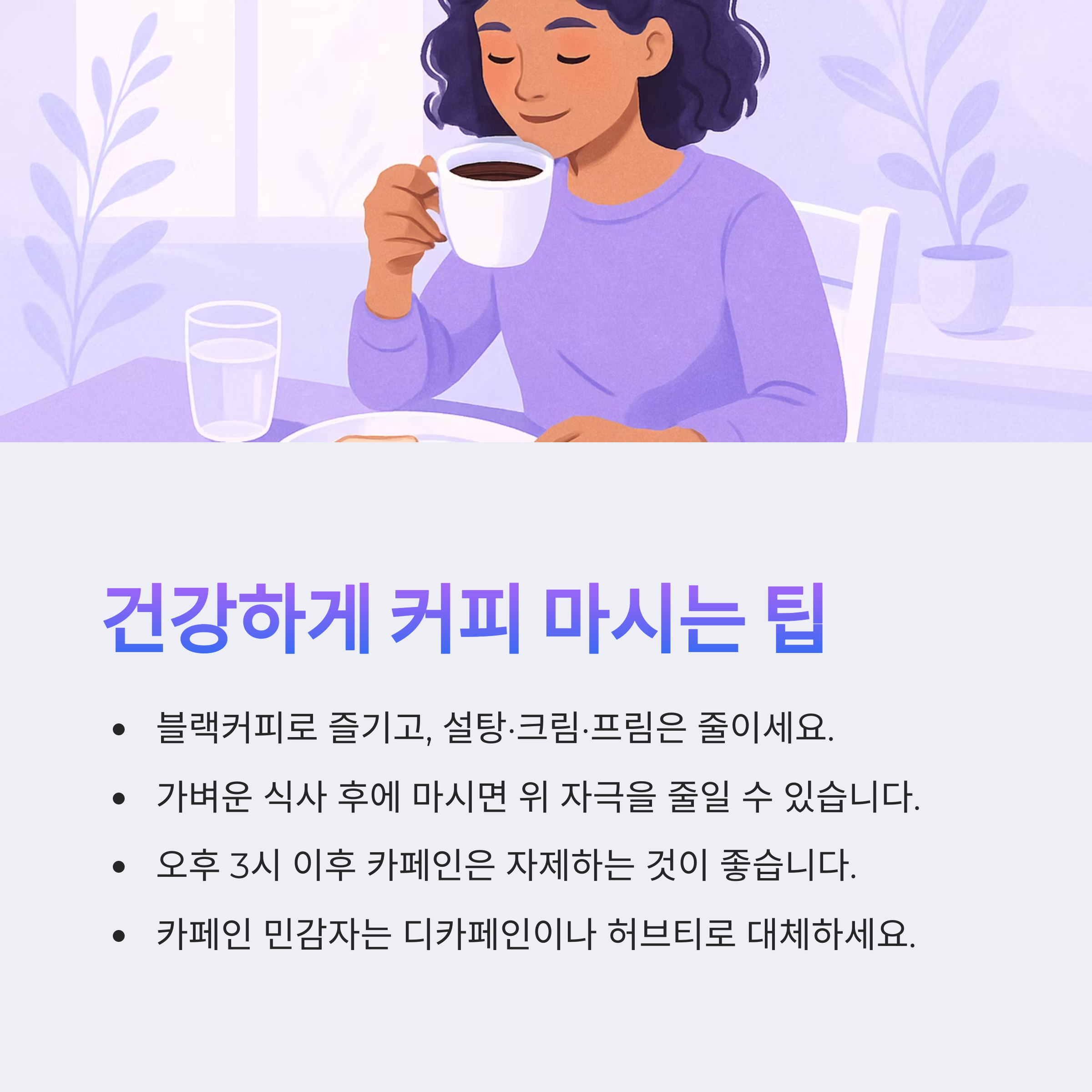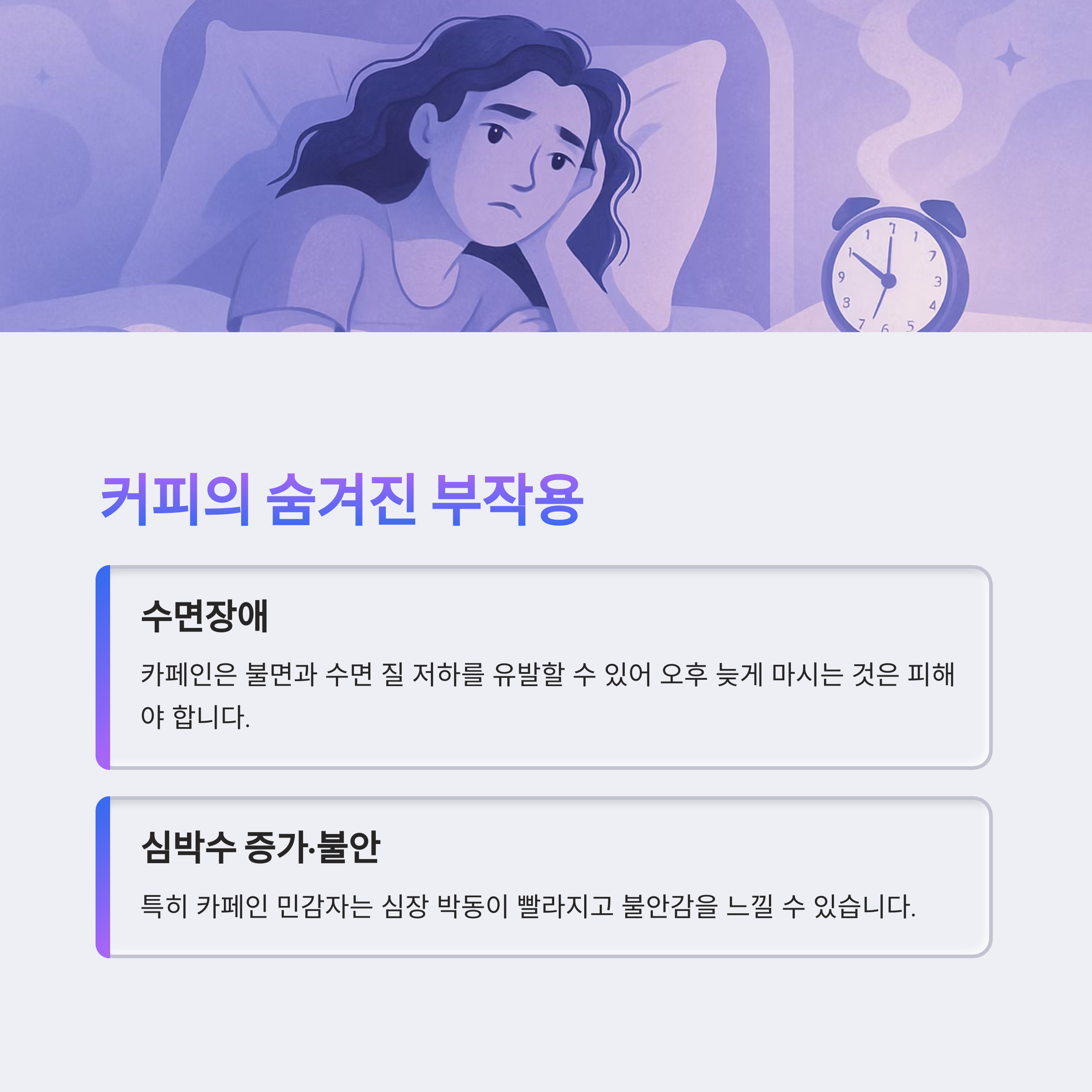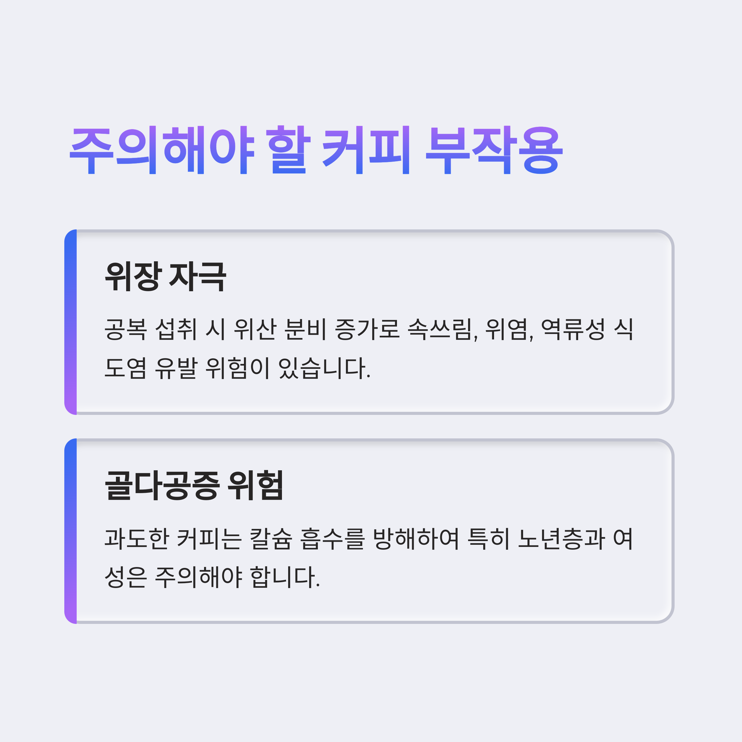 그러나 불면증, 위장 자극, 골다공증 위험 등 부작용도 있으므로, 하루 3~4잔 이내 적절량이 중요합니다.