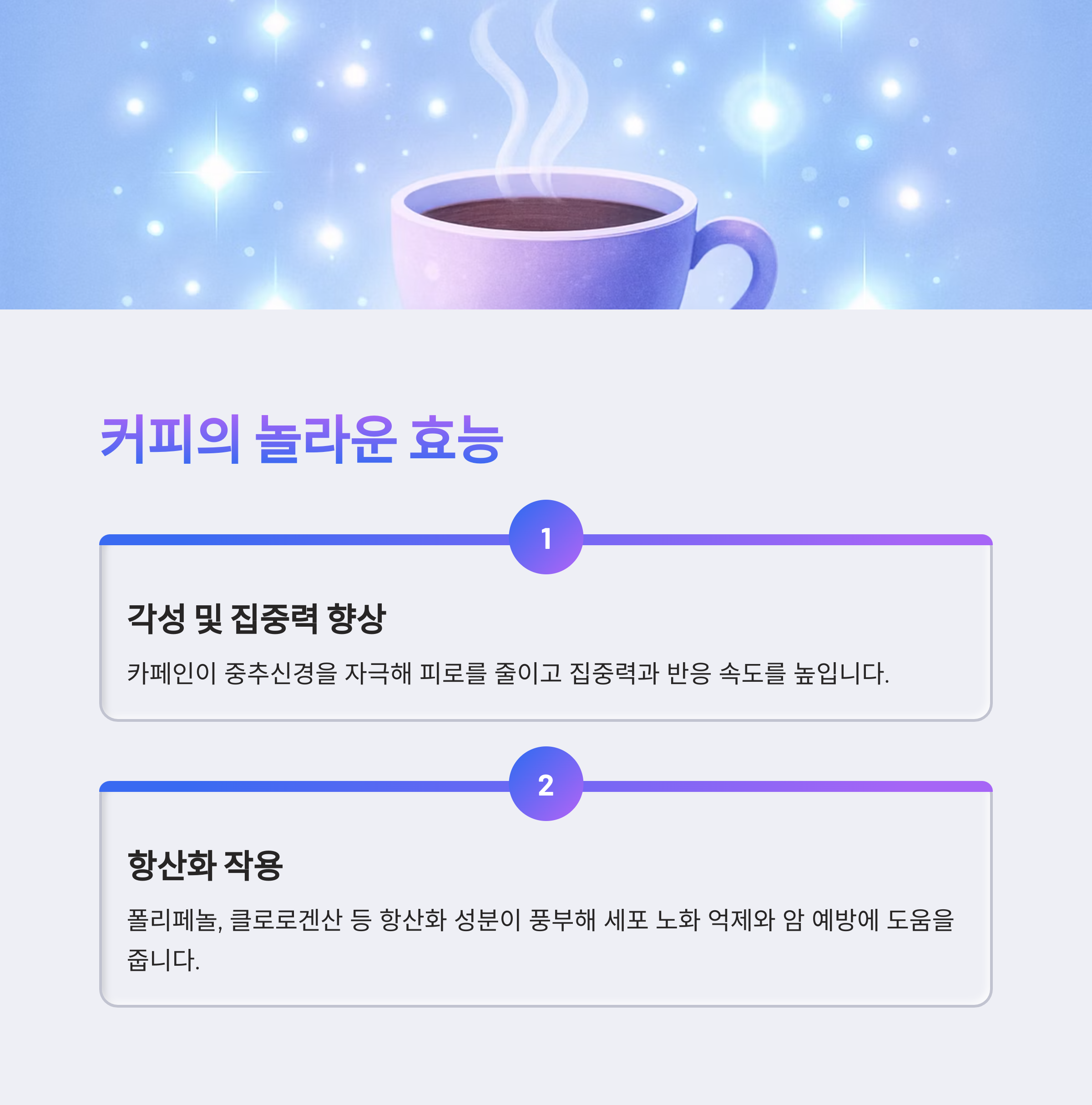 커피는 각성과 집중력 향상, 항산화 효과, 심혈관·간 건강 증진 등 다양한 장점을 가지고 있습니다.