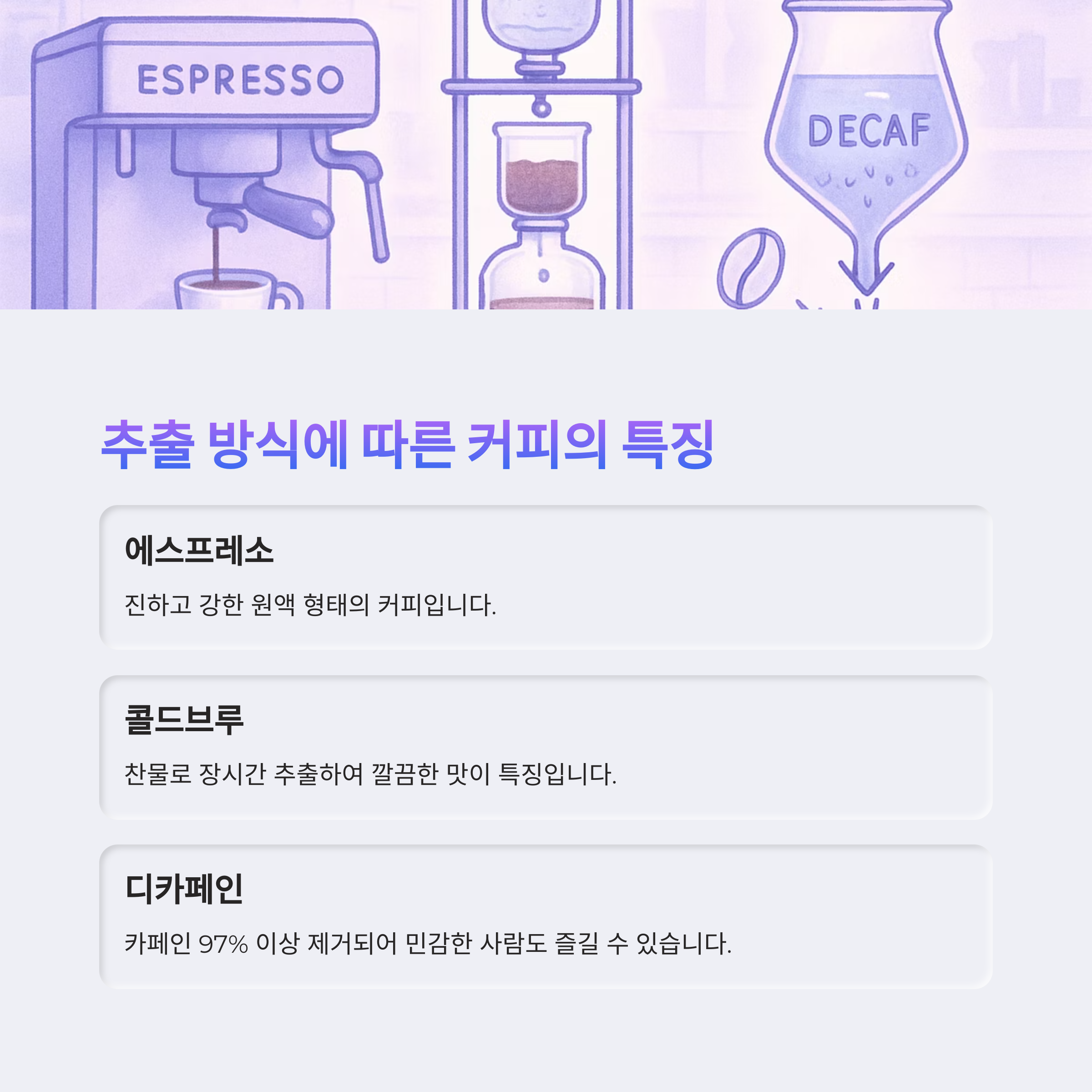 - 콜드브루/더치: 찬물 장시간 추출, 깔끔한 맛