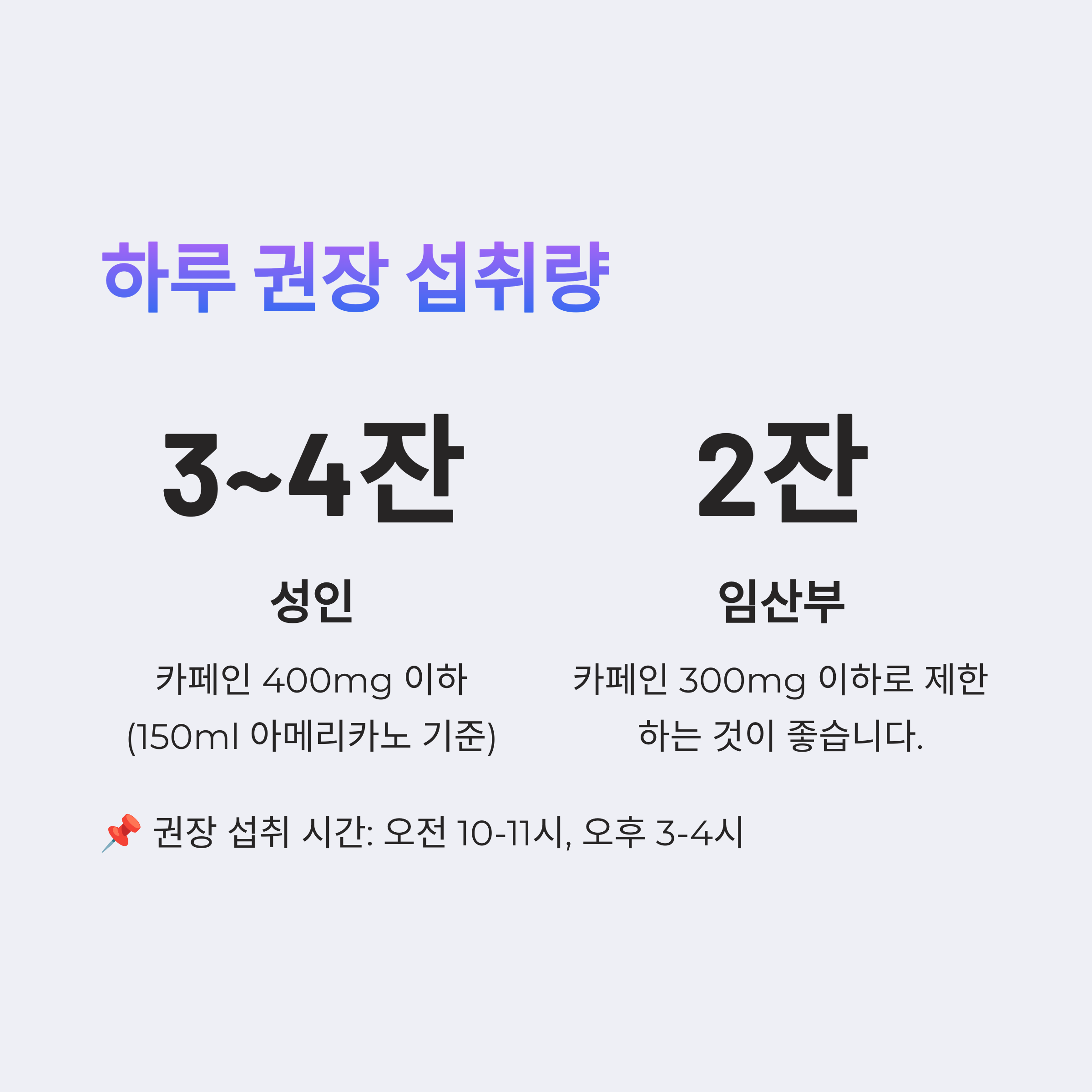 → 성인의 하루 권장 섭취량은 카페인 400mg 이하, 즉 아메리카노 기준 3~4잔입니다. 커피 효능과 부작용을 모두 고려해볼 때, 이 범위를 넘기지 않는 것이 건강에 이상적인 섭취량입니다.