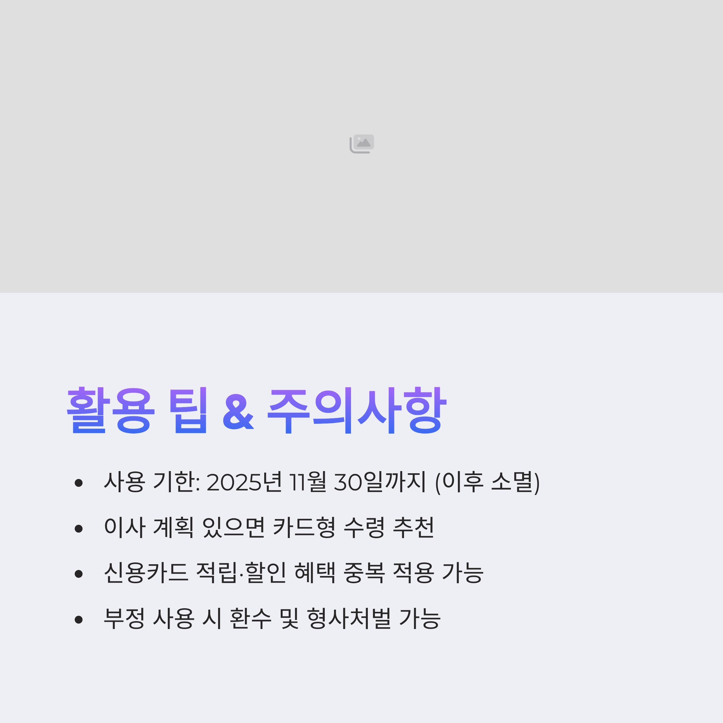 - 사용 기한: 2025년 11월 30일(일)까지 사용 가능 (기한 경과 시 잔액 자동 소멸)