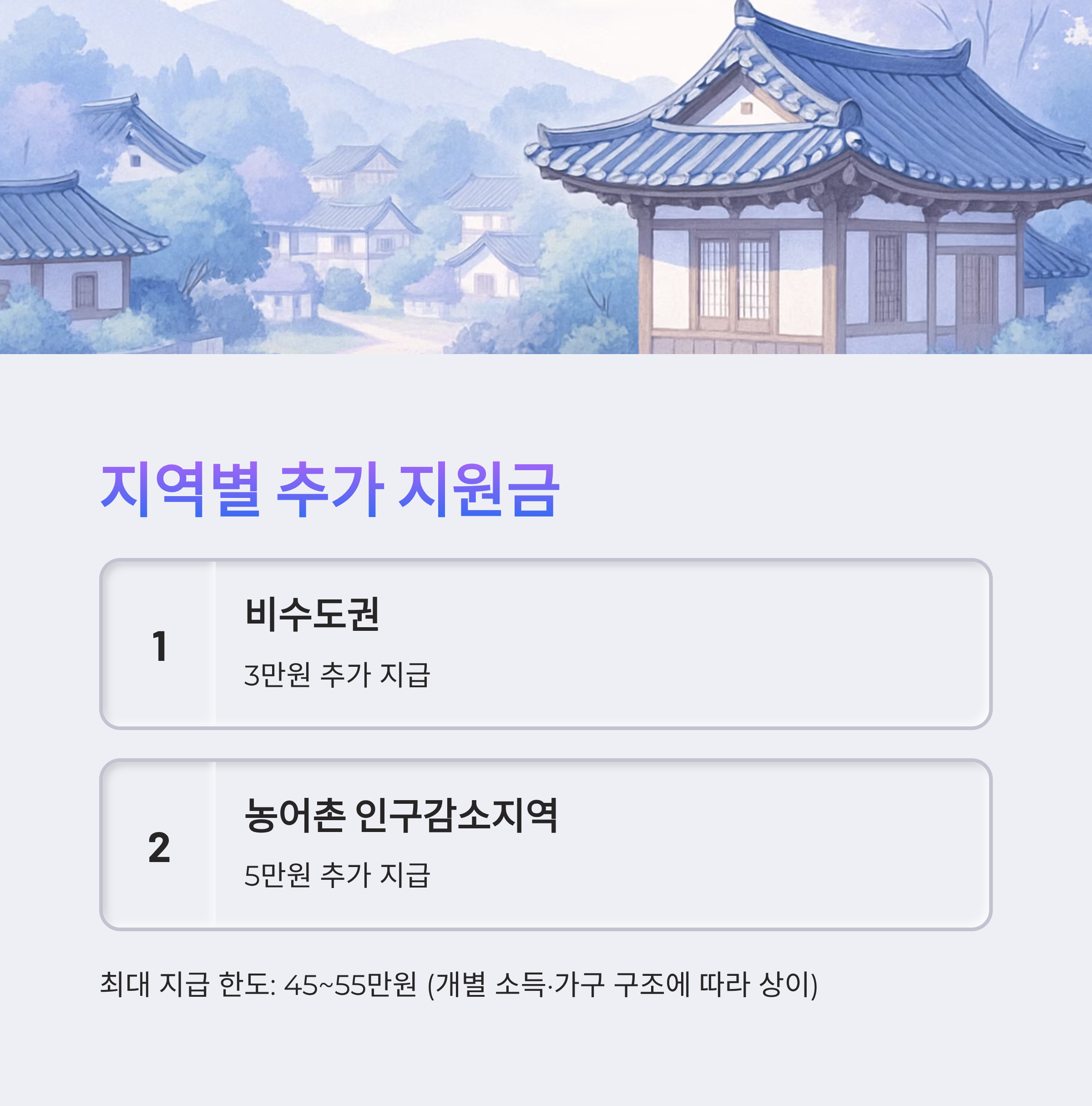 - 지자체 추가금액: 지역에 따라 비수도권은 3만 원, 농어촌 인구감소지역은 5만 원 추가 지급