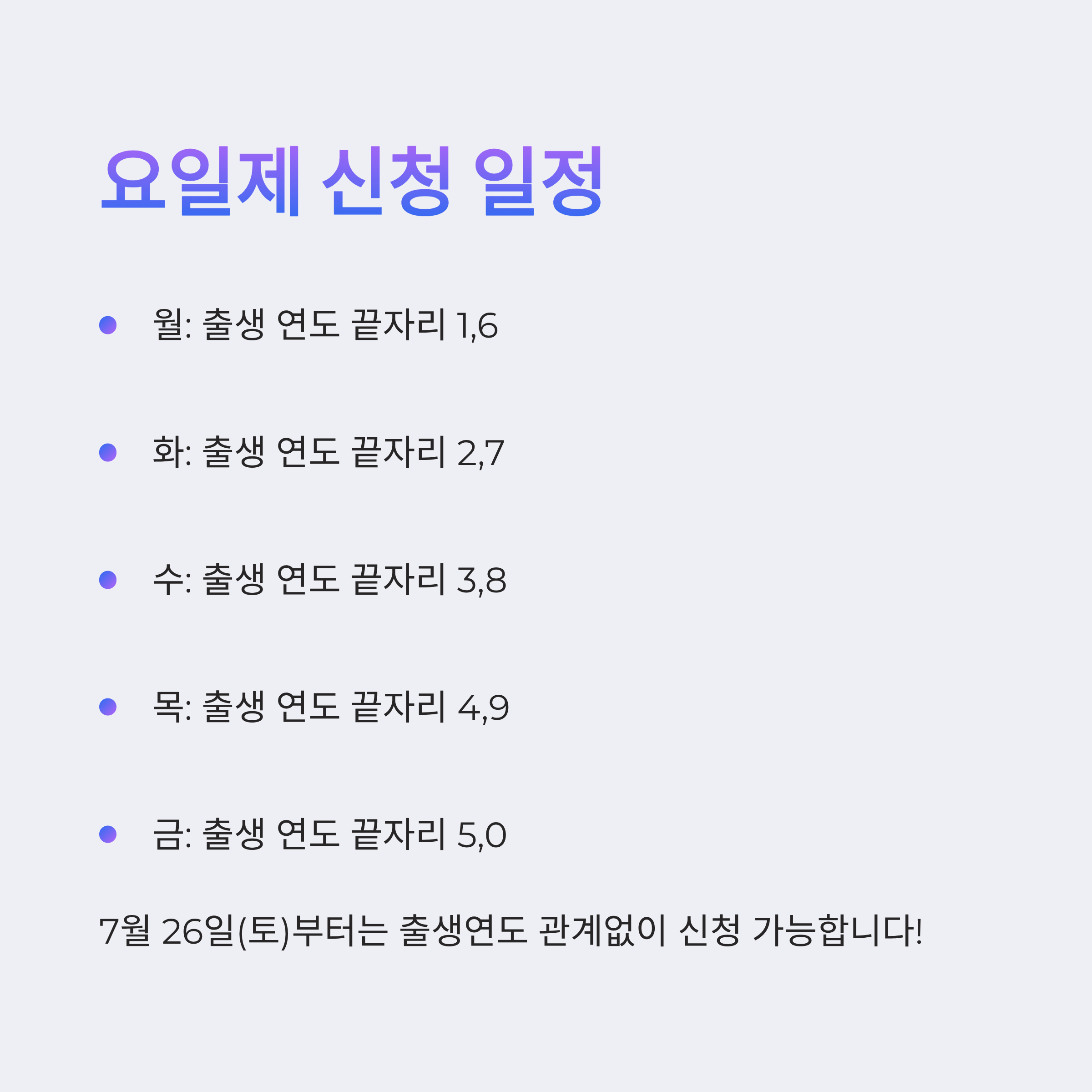 - 7월 26일(토)부터는 출생연도 관계없이 신청 가능
