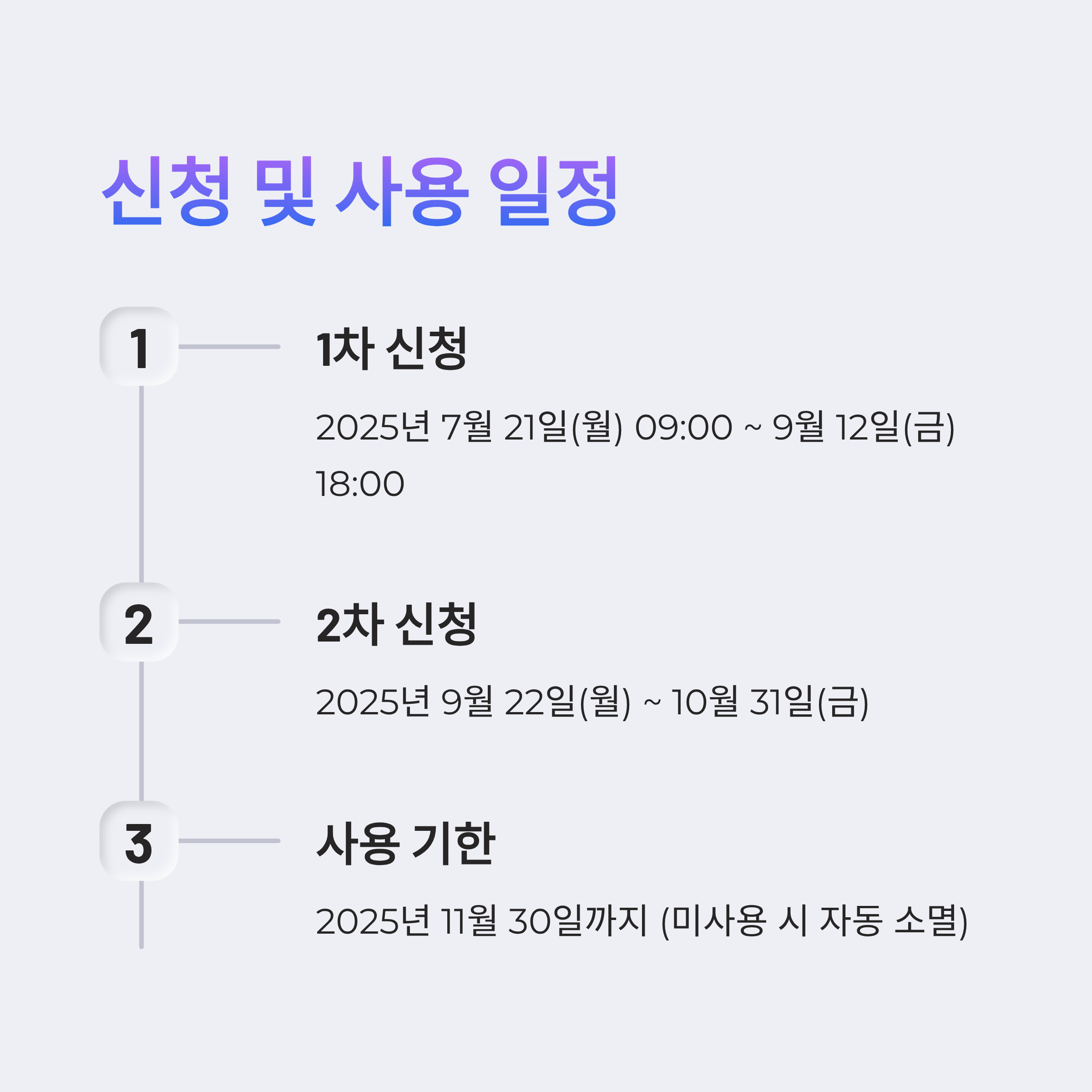 - 1차 신청: 2025년 7월 21일(월) 09:00 ~ 9월 12일(금) 18:00