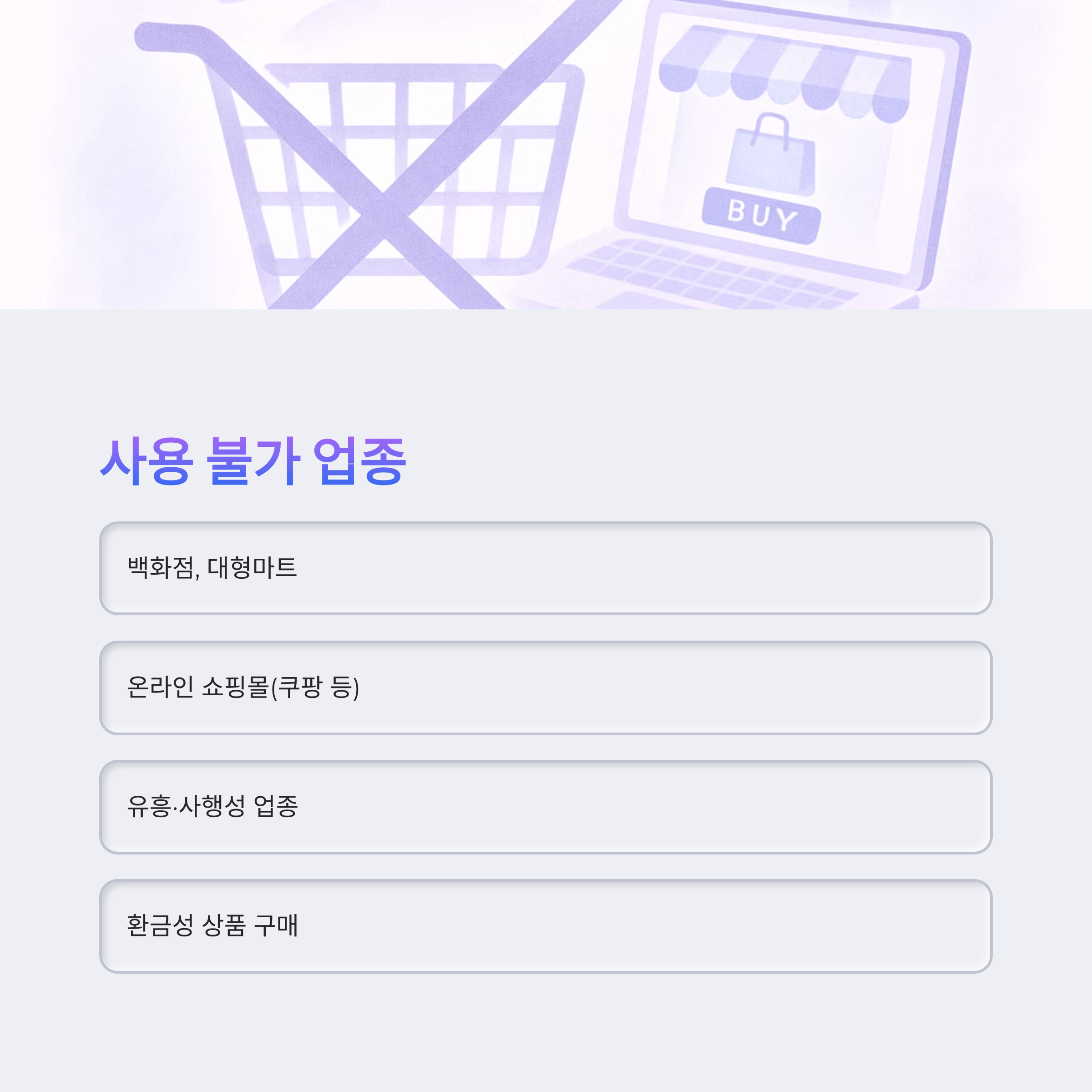 - 백화점, 대형마트, 온라인 쇼핑몰(쿠팡 등), 유흥·사행성 업종, 환금성 상품 구매 등