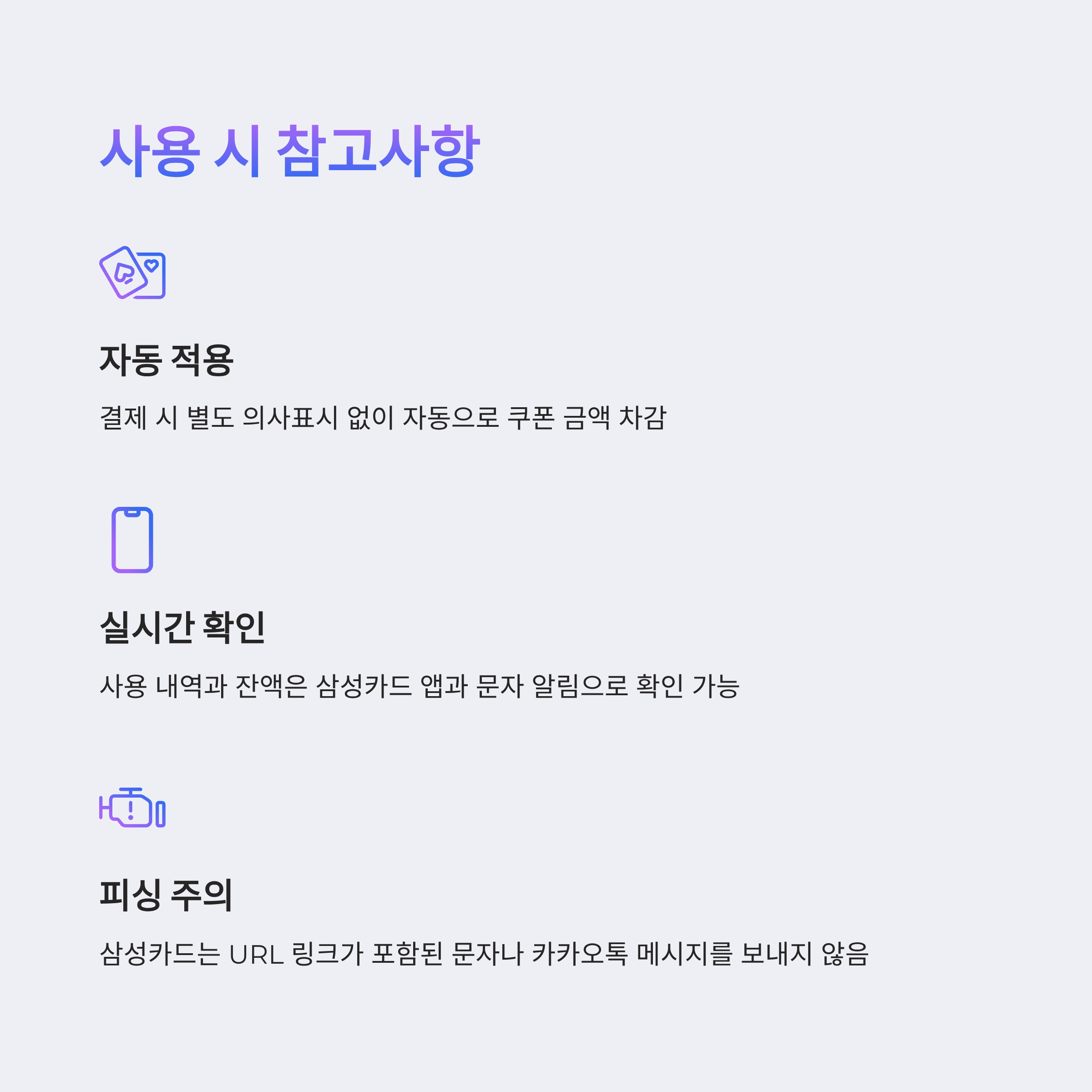 - 자동 적용: 삼성카드로 결제 시 사용 의사를 표시하지 않아도 자동으로 쿠폰 금액이 차감됨