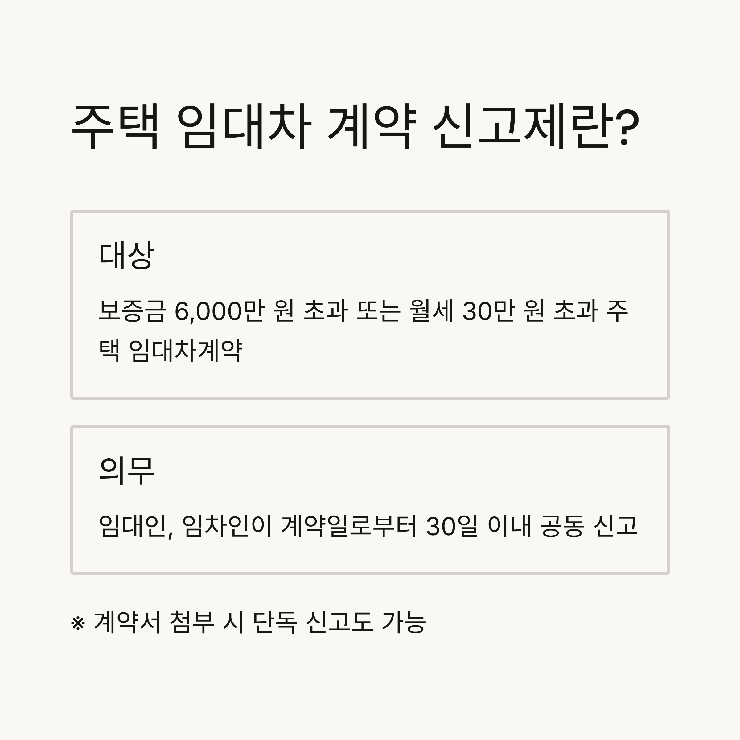 보증금 6,000만 원 초과 또는 월세 30만 원 초과 주택 임대차계약(전세·월세 등)은 일정 기간 내 의무적으로 신고해야 하는 제도입니다. - 신고 의무: