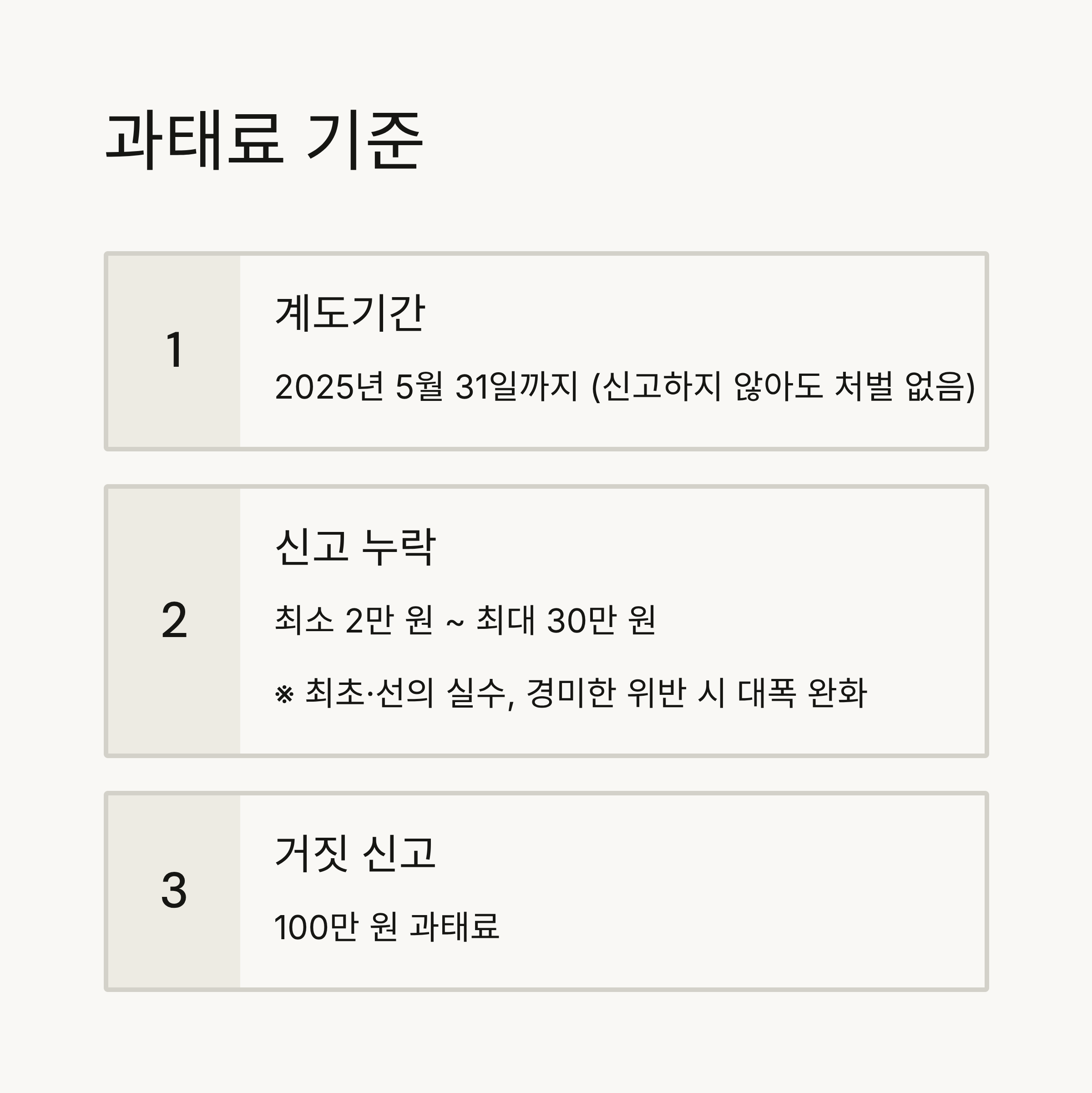 - 신고 누락: 최소 2만 원 ~ 최대 30만 원(최초·선의 실수, 경미한 위반 땐 대폭 완화)
