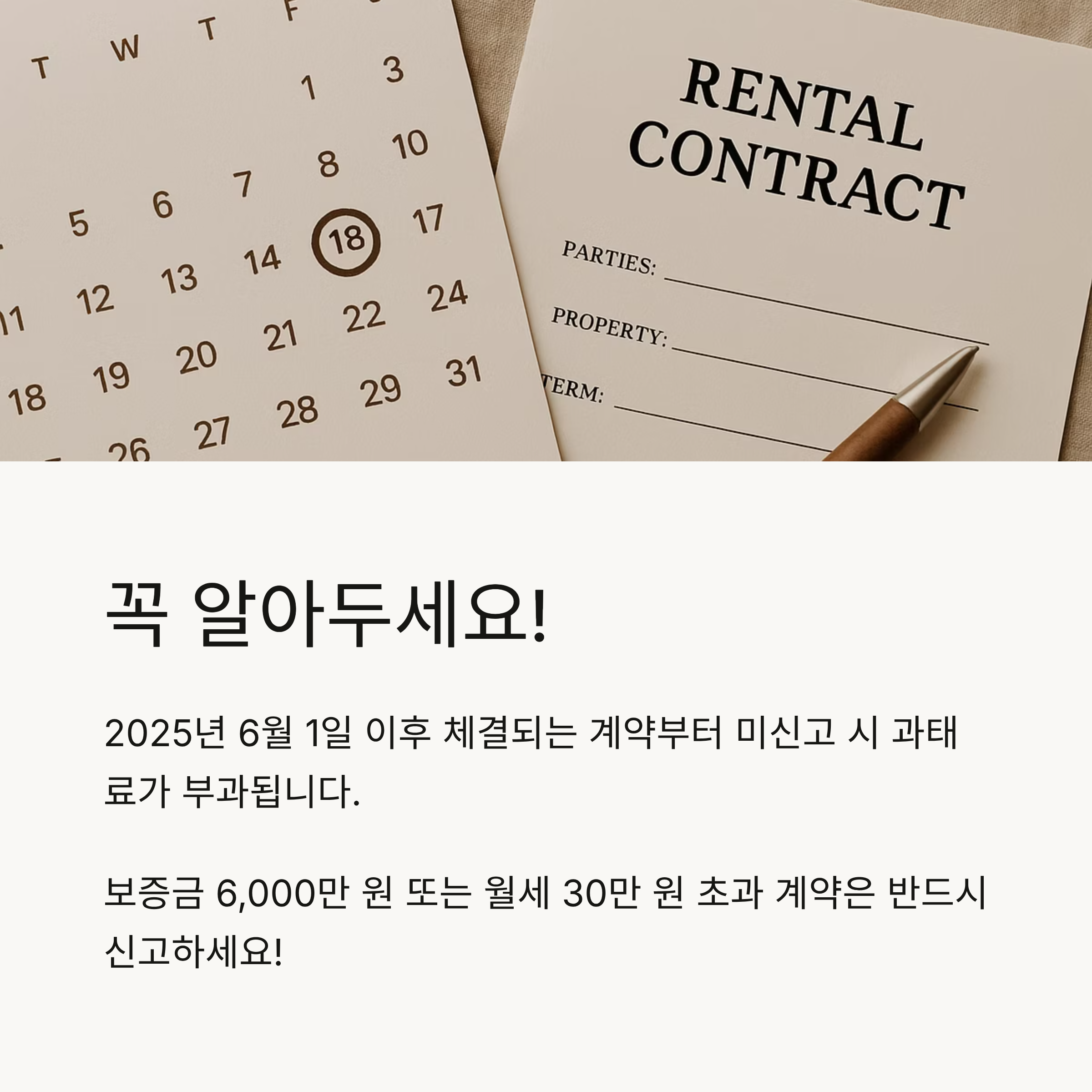 2025년 6월 1일 이후 체결되는 보증금 6,000만 원 또는 월세 30만 원 초과 주택 임대차 계약은 반드시 30일 내 신고해야 하며, 신고만 해도 확정일자 효과·권리 보호가 됩니다. 미신고 시 과태료가 부과되니 잊지 말고 온라인 또는 주민센터를 이용해 빠르게 신고하세요!