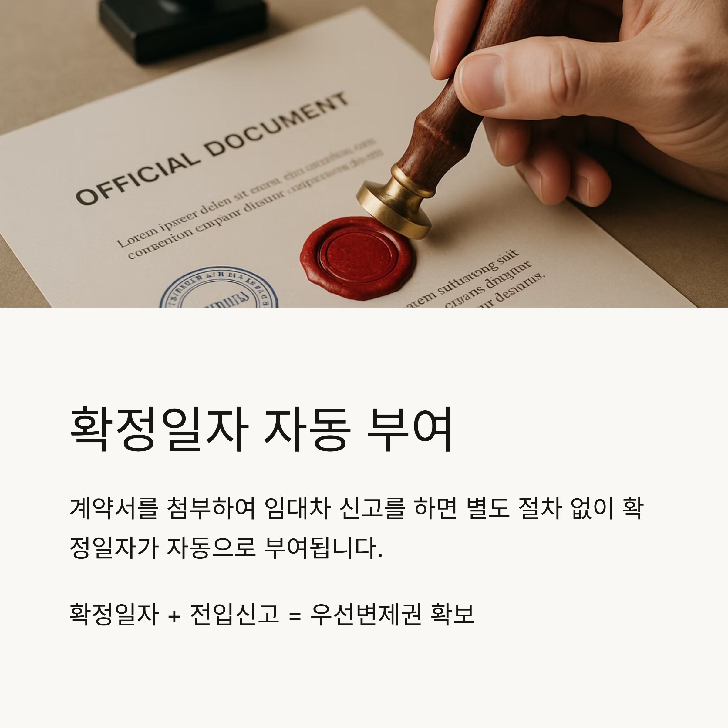 - “확정일자+전입신고”를 모두 마치면, 임차인은 우선변제권 확보(전세보증금 등 안전하게 돌려받을 권리)를 갖게 됩니다.