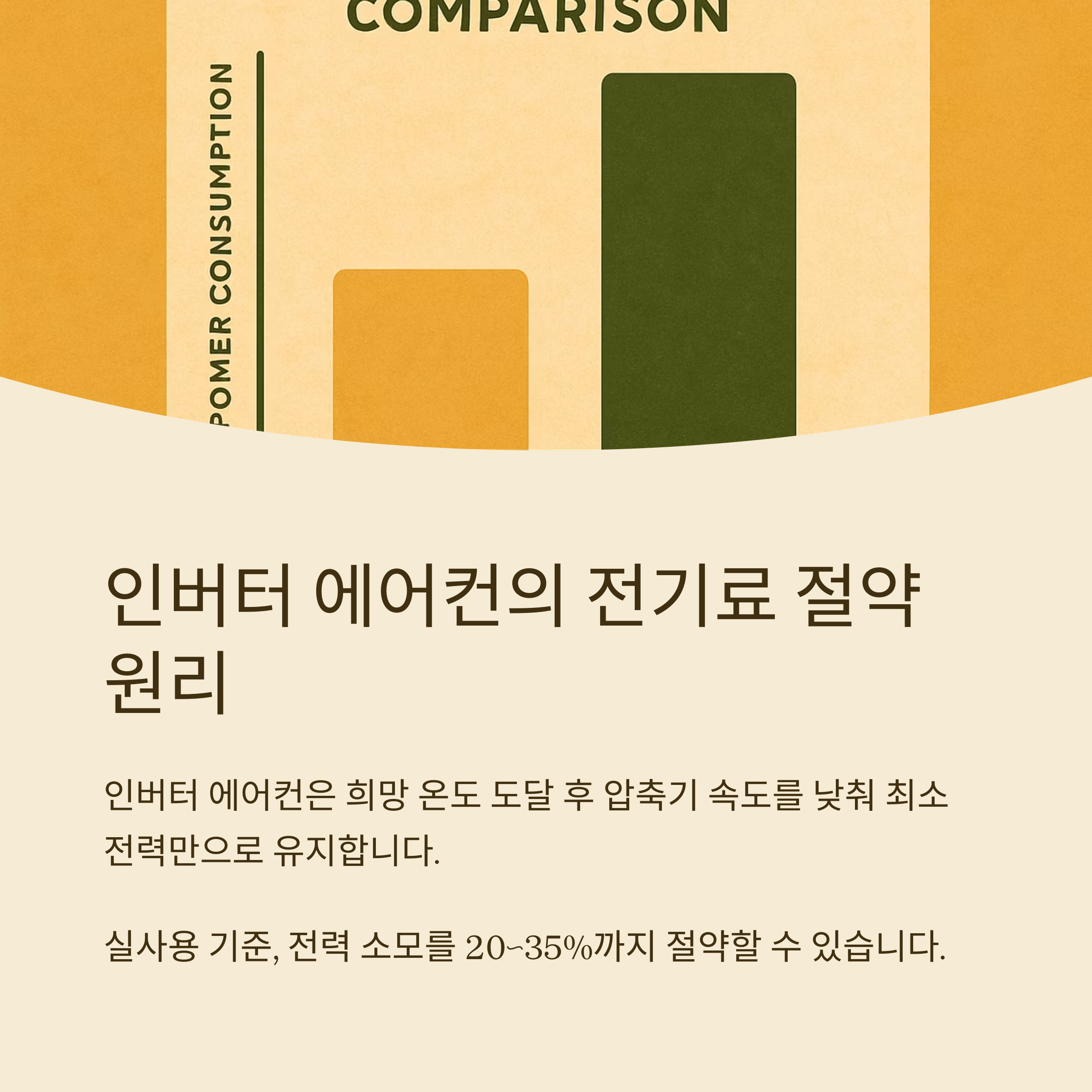 기존 정속형(ON/OFF) 에어컨은 설정 온도에 도달하면 꺼졌다가 다시 켜지는 방식으로 전력 소모가 컸지만, 인버터 방식은 설정 온도를 유지하면서도 전력을 최소화합니다.