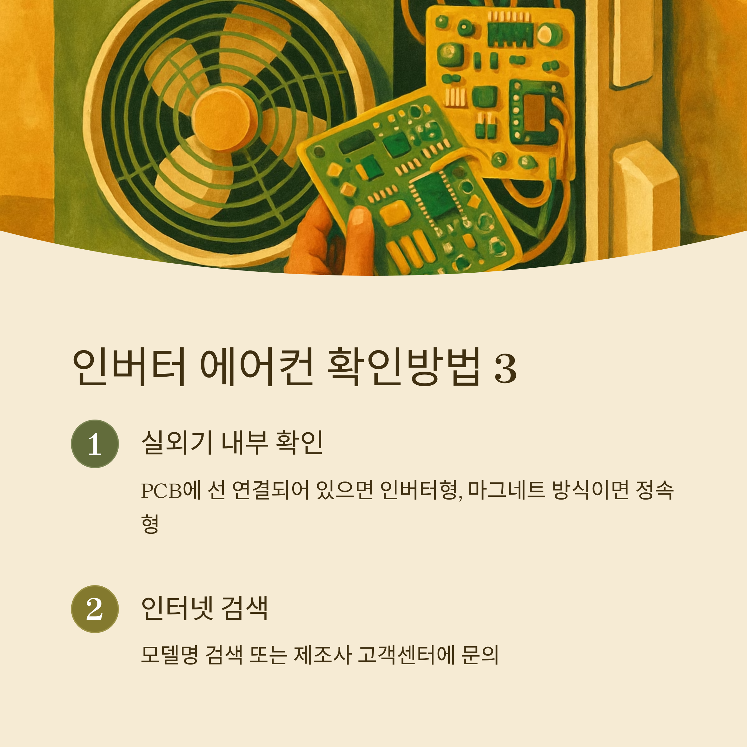 | 실외기 내부 | PCB에 선 연결되어 있으면 인버터형, 마그네트 방식이면 정속형 |