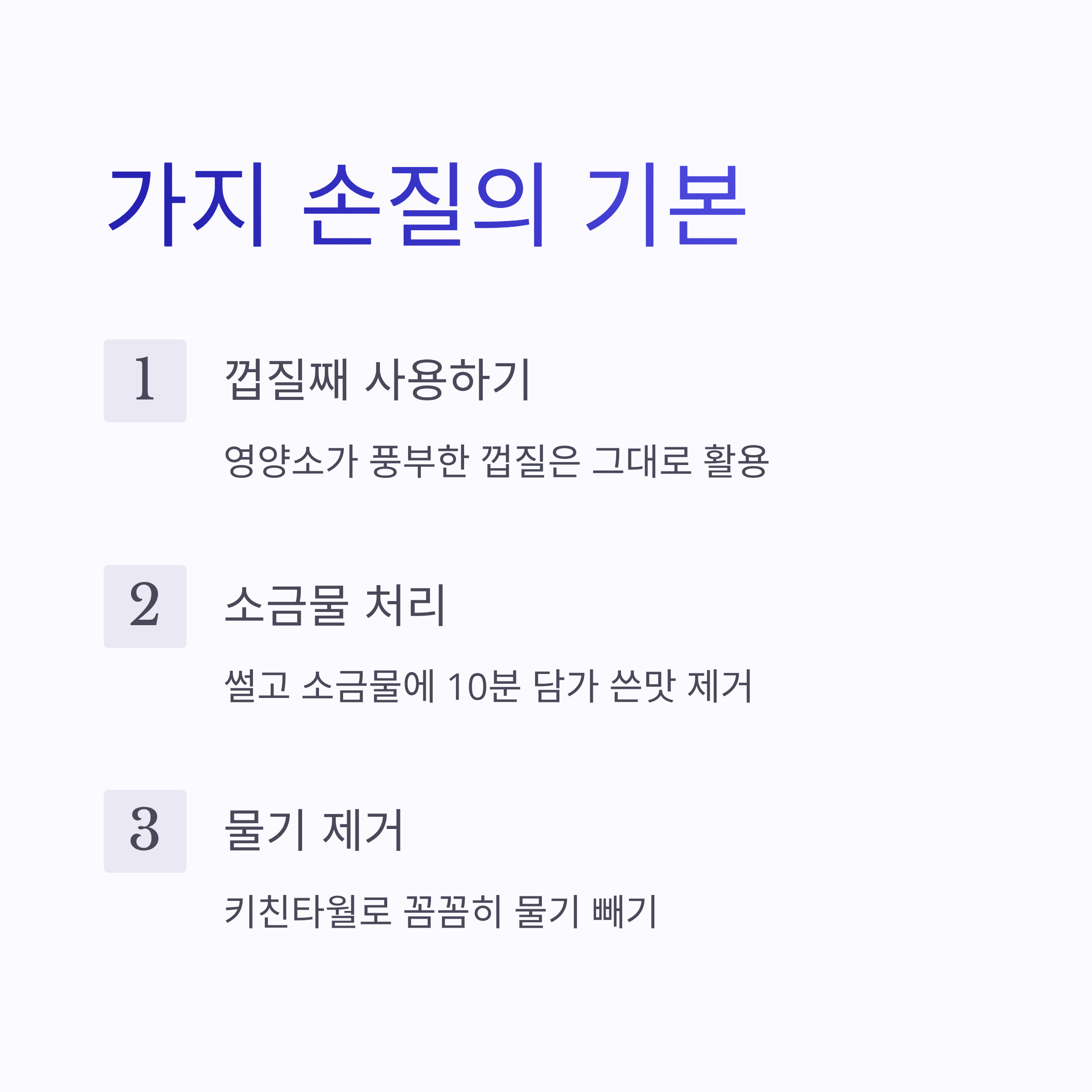 - 쓴맛 제거: 썰고 소금물에 10분 담갔다가 물기 제거