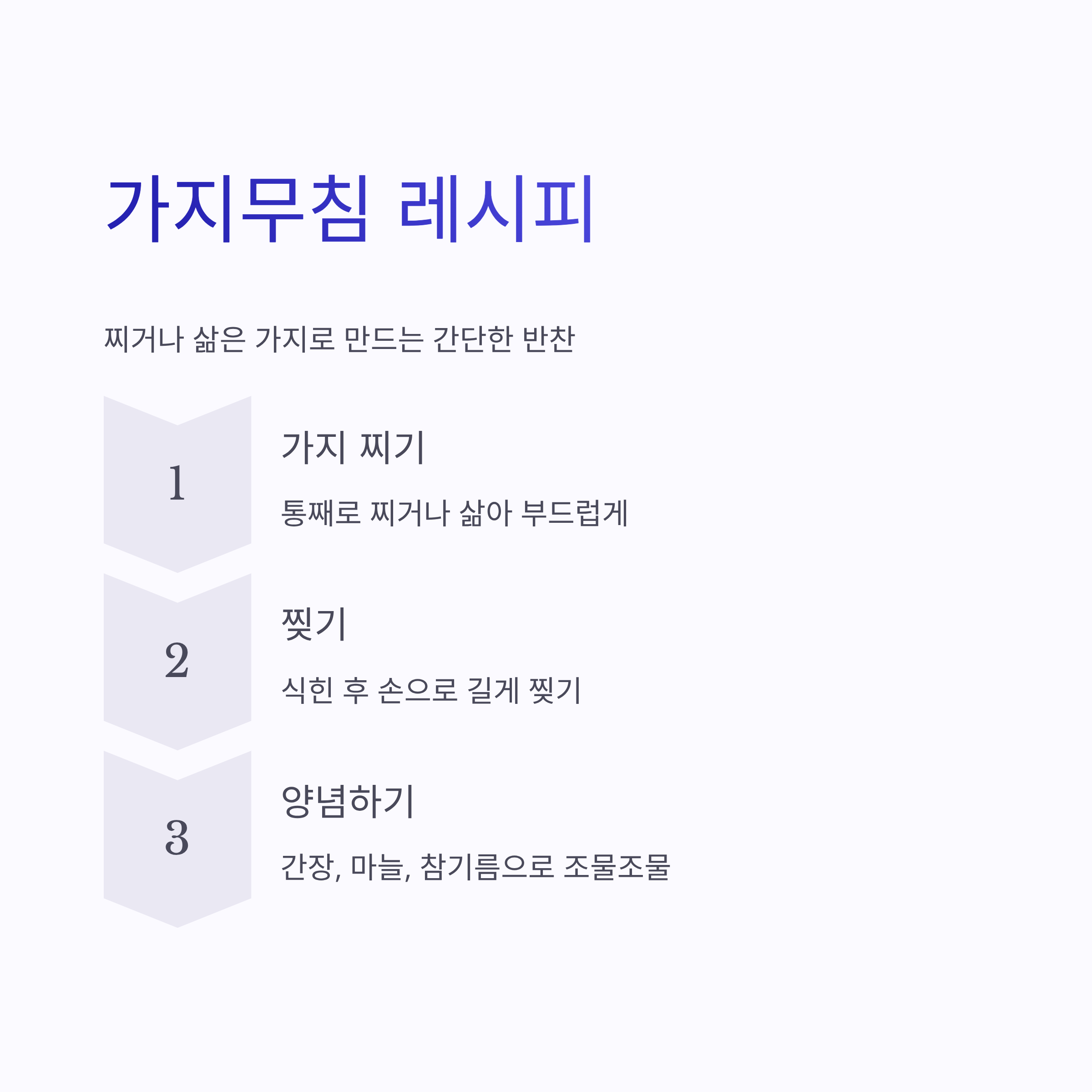 - 가지무침: 찌거나 삶은 가지를 찢고 간장·마늘·참기름 등으로 조물조물