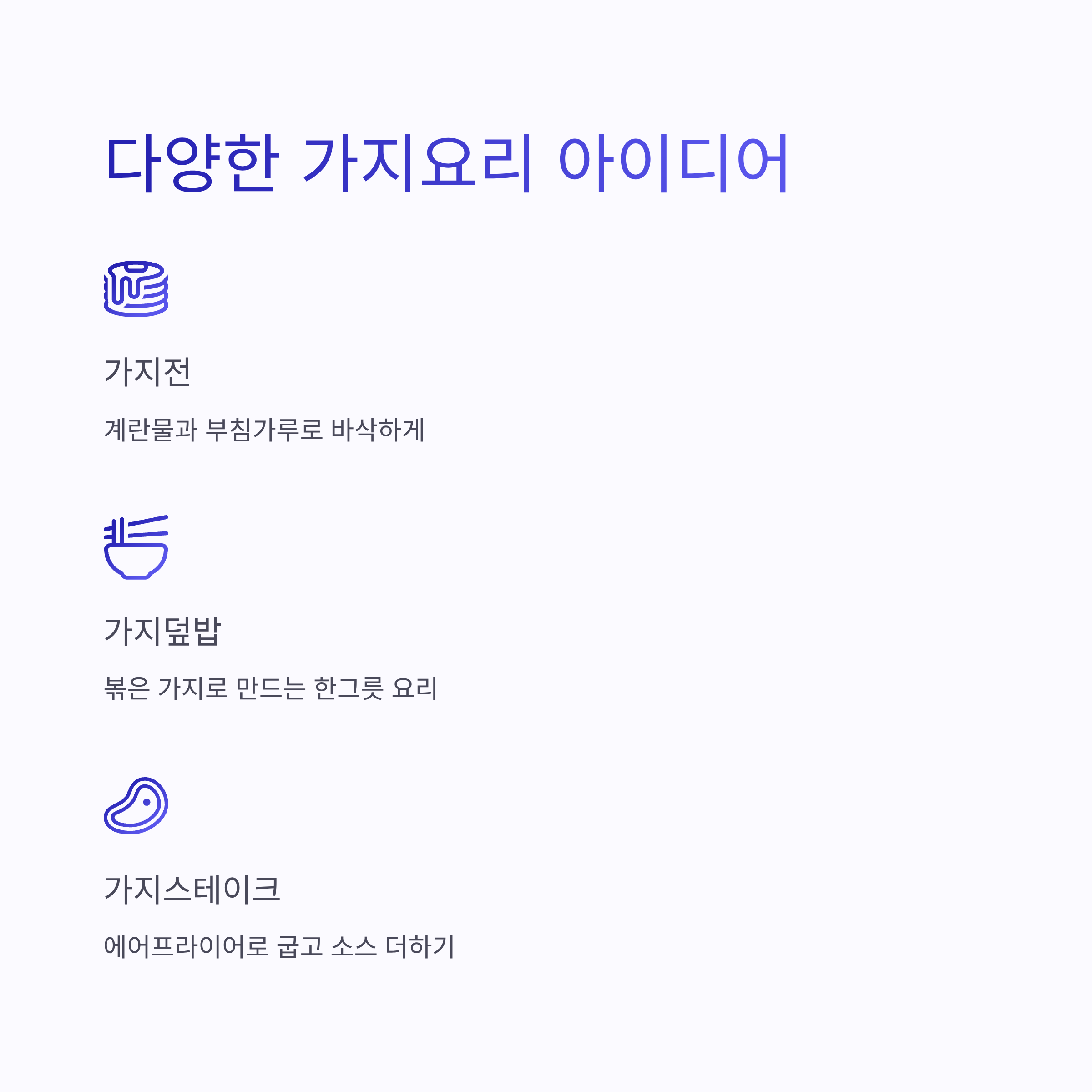 이번 글에서는 가지요리를 맛있게 만드는 핵심 팁부터 기본 가지볶음, 가지구이, 무침 등 실속 레시피까지 정리해드립니다.