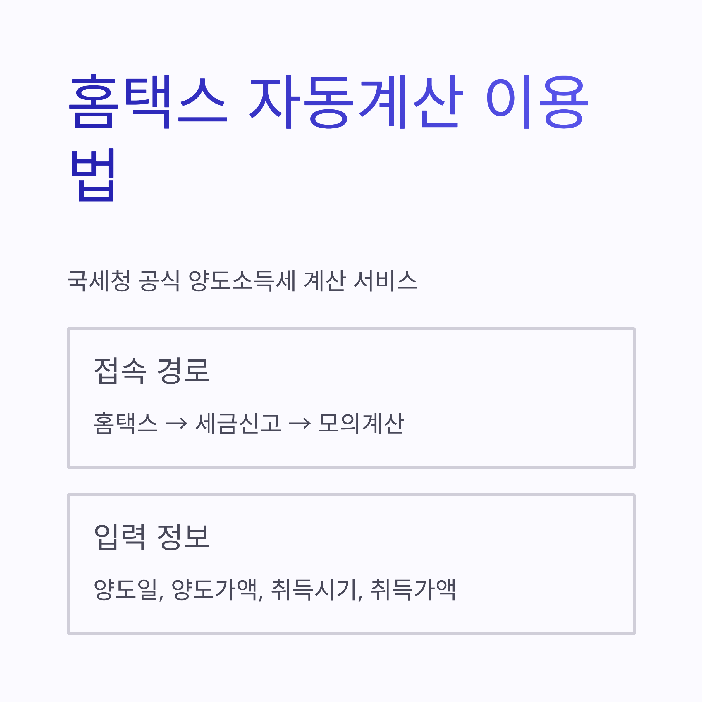 - 국세청 홈택스 등에서 제공하는 양도소득세 자동계산 바로가기를 통해 실제 양도가액과 취득가액, 보유기간 등을 입력하면 자신의 예상 양도소득세를 간편하게 확인할 수 있습니다. 복잡한 계산이 어려울 때 누구나 활용할 수 있는 대표적인 방법입니다.