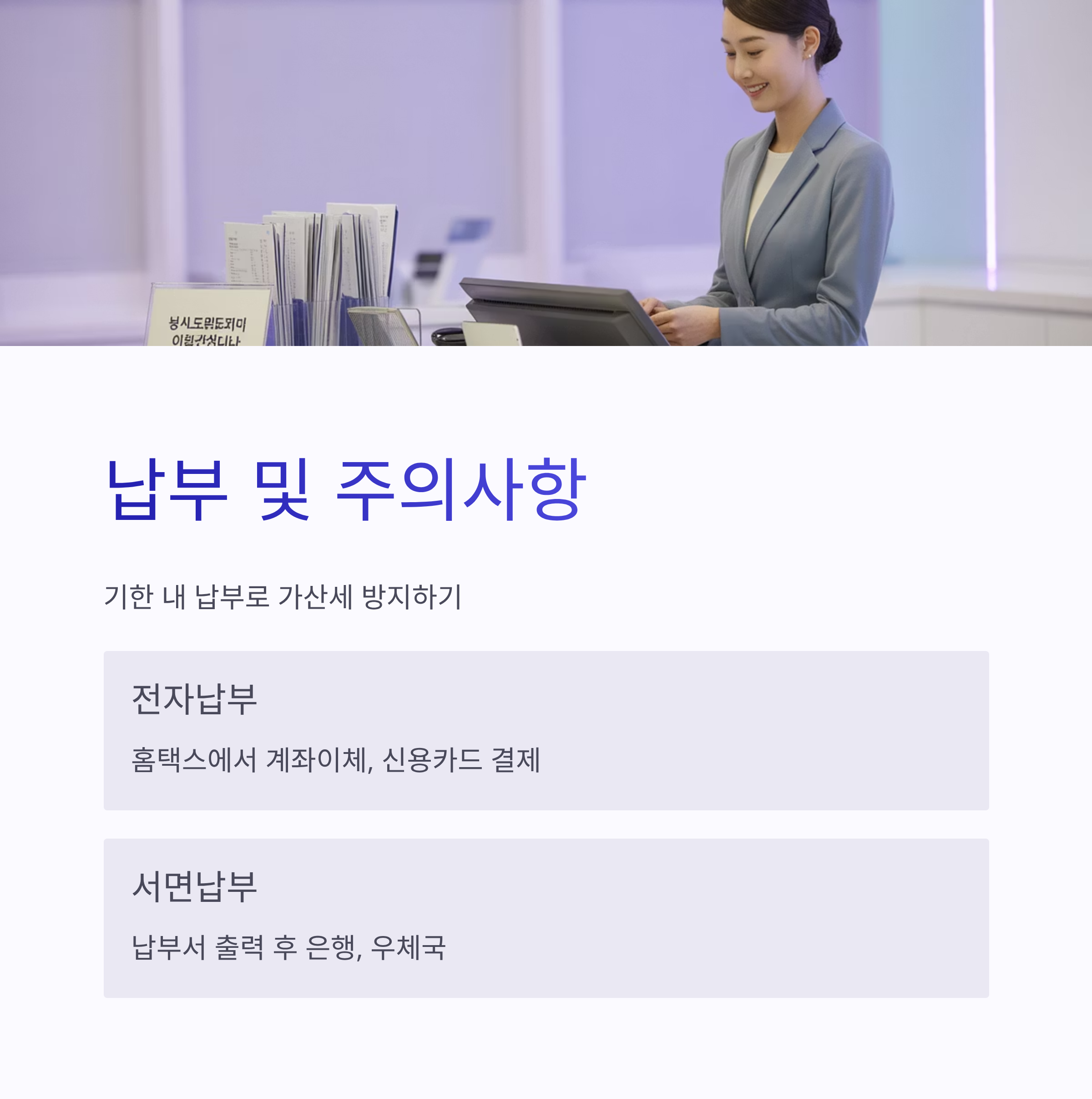 - 신고 시 산출된 금액을 홈택스에서 직접 계좌이체, 신용카드 등으로 전자납부 가능