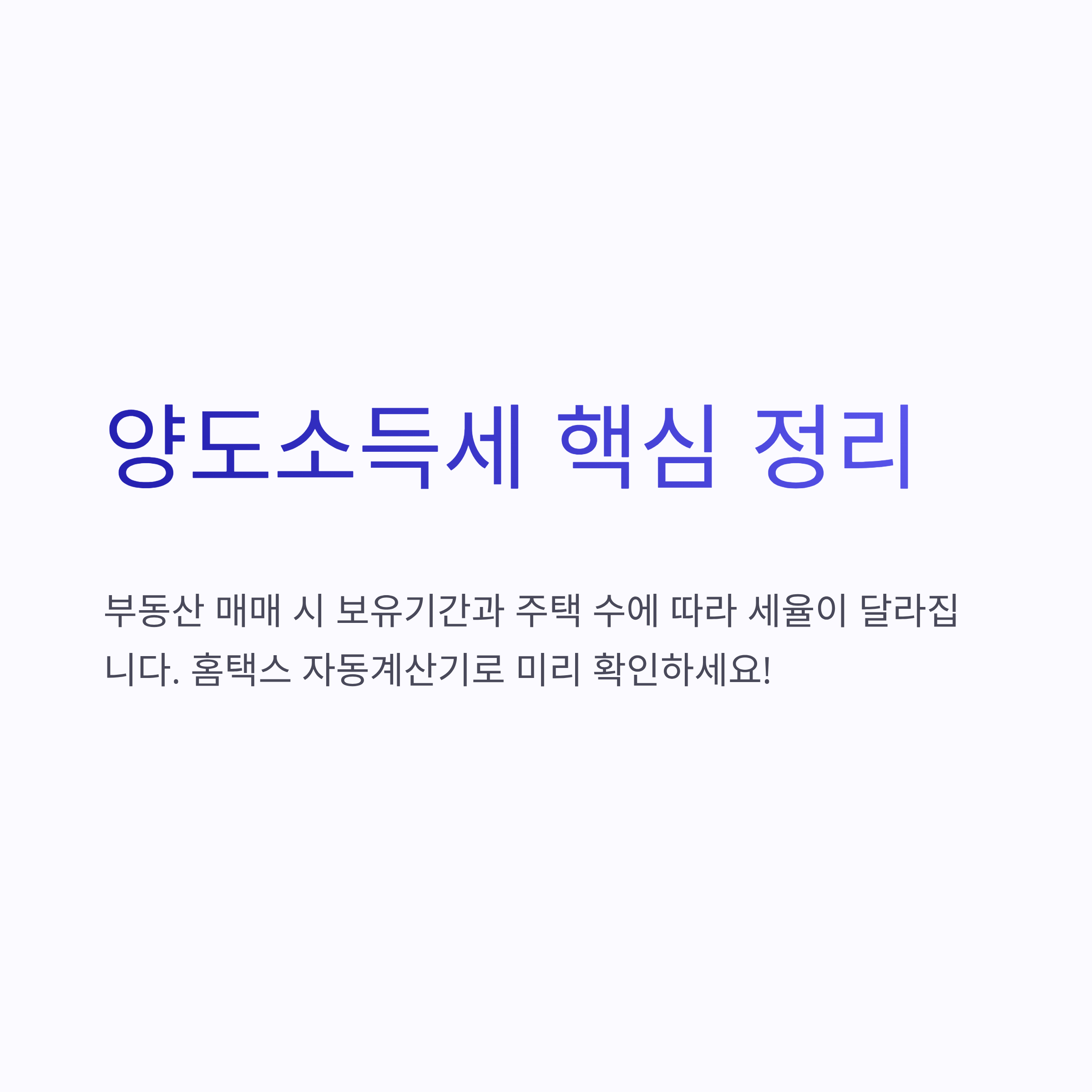 양도소득세는 부동산·주식 등 자산을 유상으로 양도할 때 이익에 부과되는 국세로, 양도일이 속하는 달의 말일부터 2개월 이내에 직접 신고·납부해야 하며, 보유 기간·주택 수·지역에 따라 세율이 달라집니다. 홈택스 등 자동계산기를 활용하면 쉽고 빠르게 예상 세액을 확인할 수 있습니다.