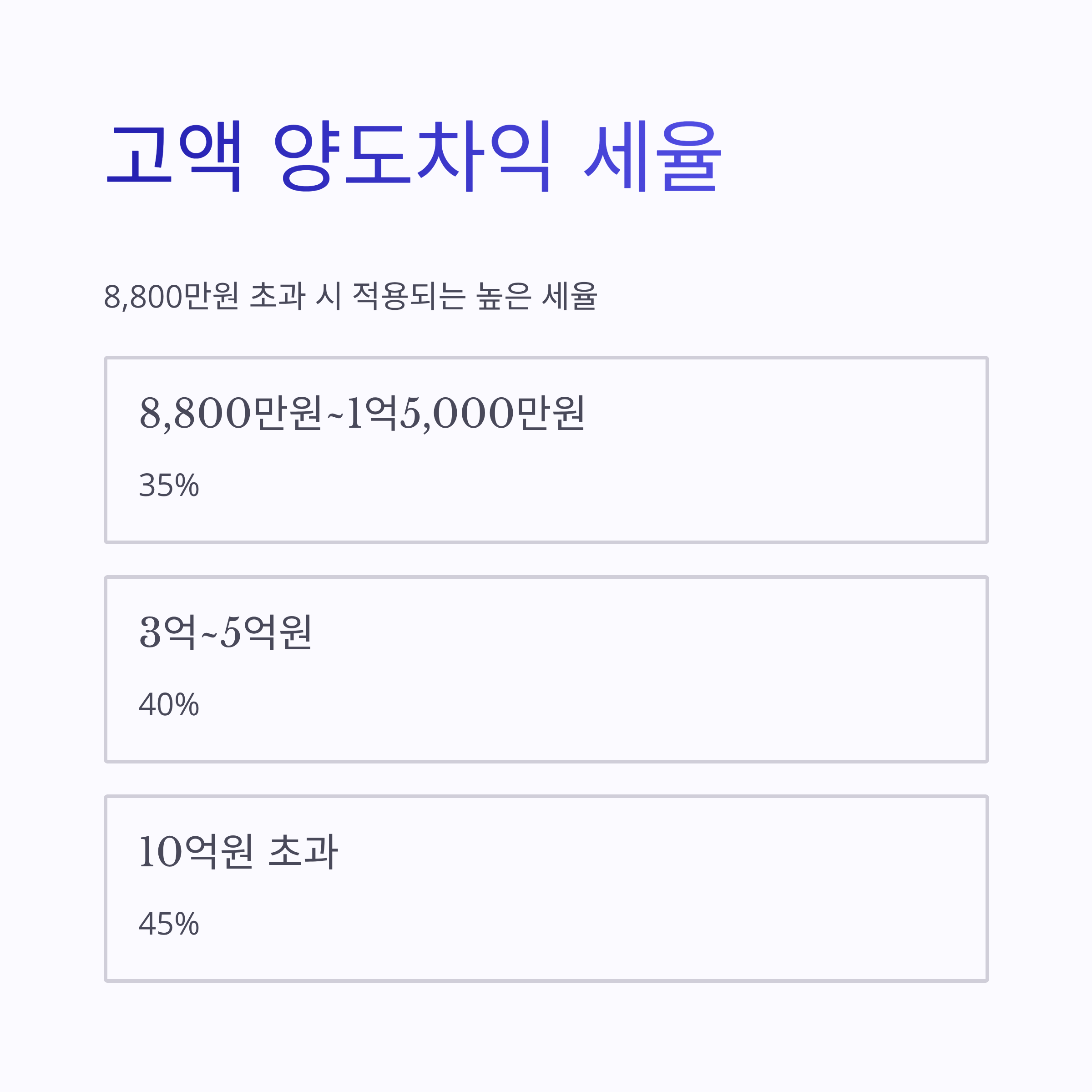 - 1년 미만 보유: 50~70%(일부 자산은 70%) 등 단기 보유 시 매우 높은 세율 적용.