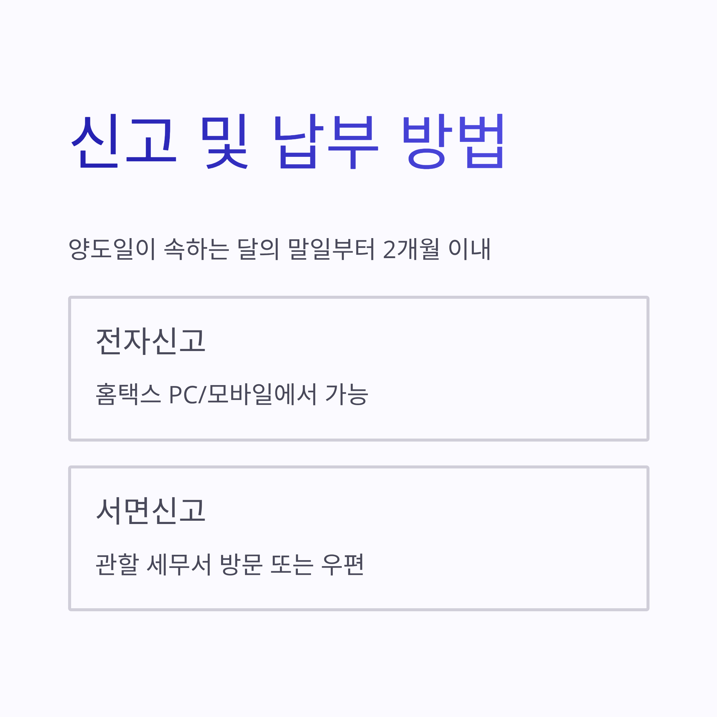 - 전자신고: 홈택스(PC/모바일)에서 가능 (로그인 후 세금신고 → 양도소득세)