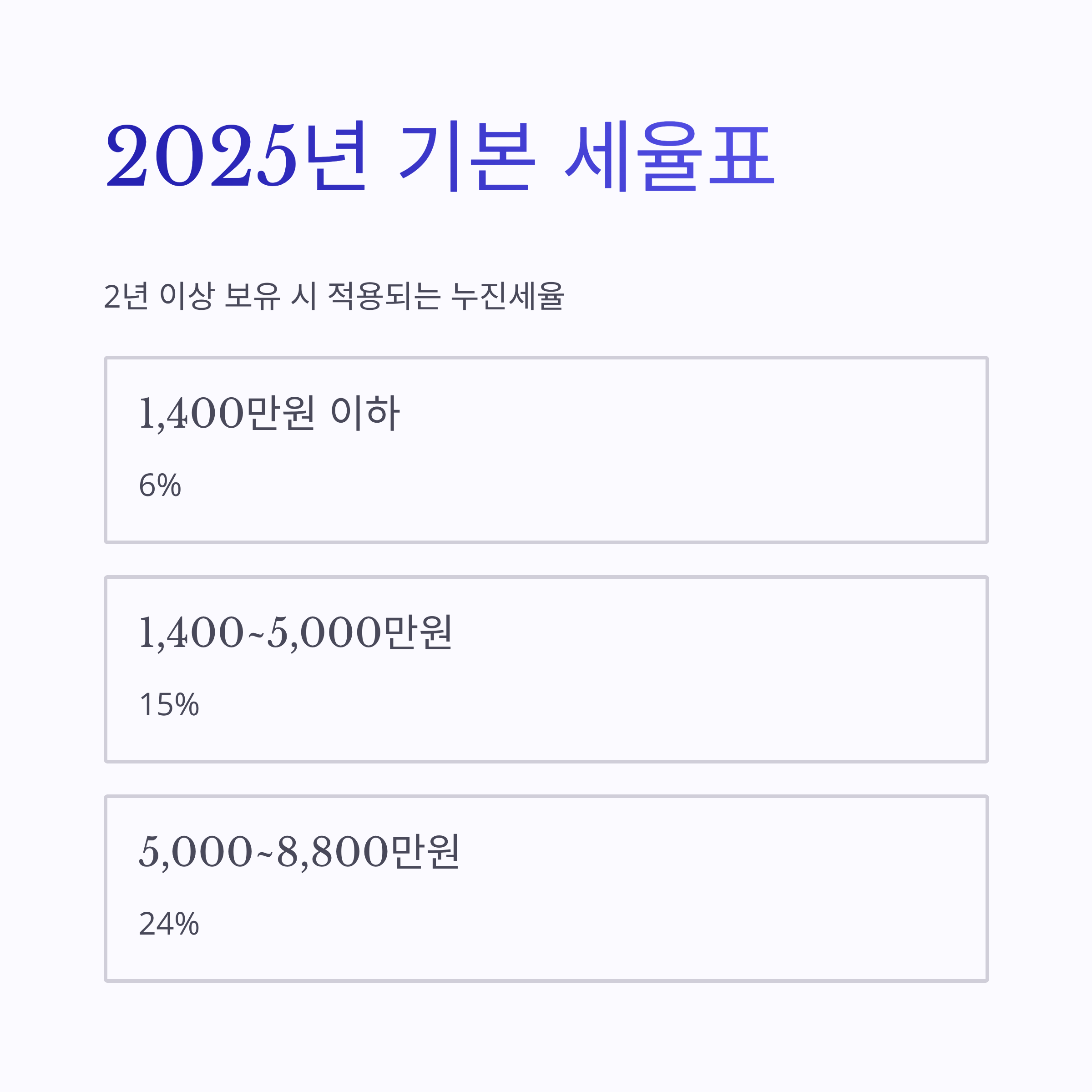 3. 기본 세율 (주택, 부동산, 주식 등 2년 이상 보유 시 기준)