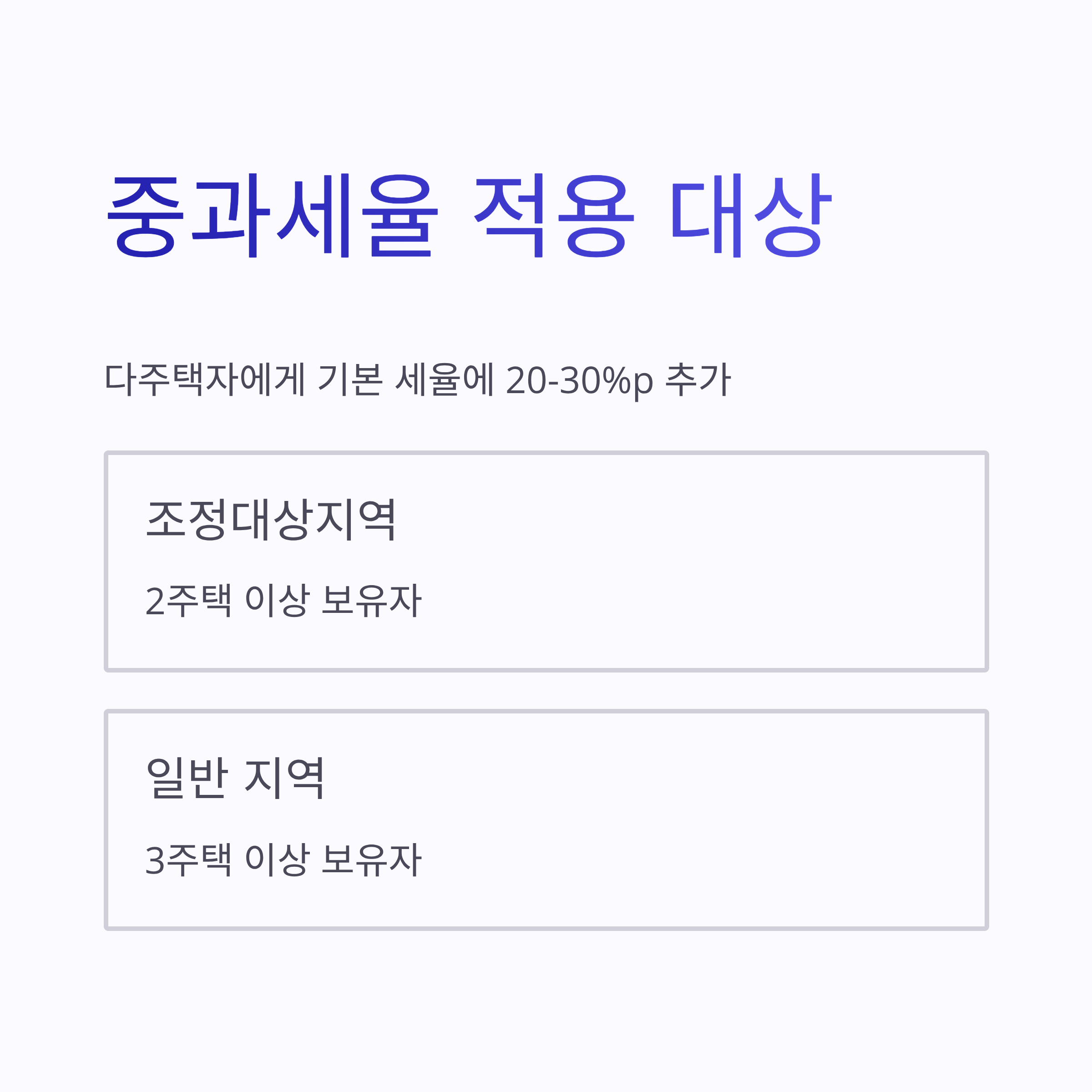 일반 세율에 10~20%p가 가산됩니다. - 분양권, 조합원입주권 등도 주택 수에 포함하여 중과 적용.