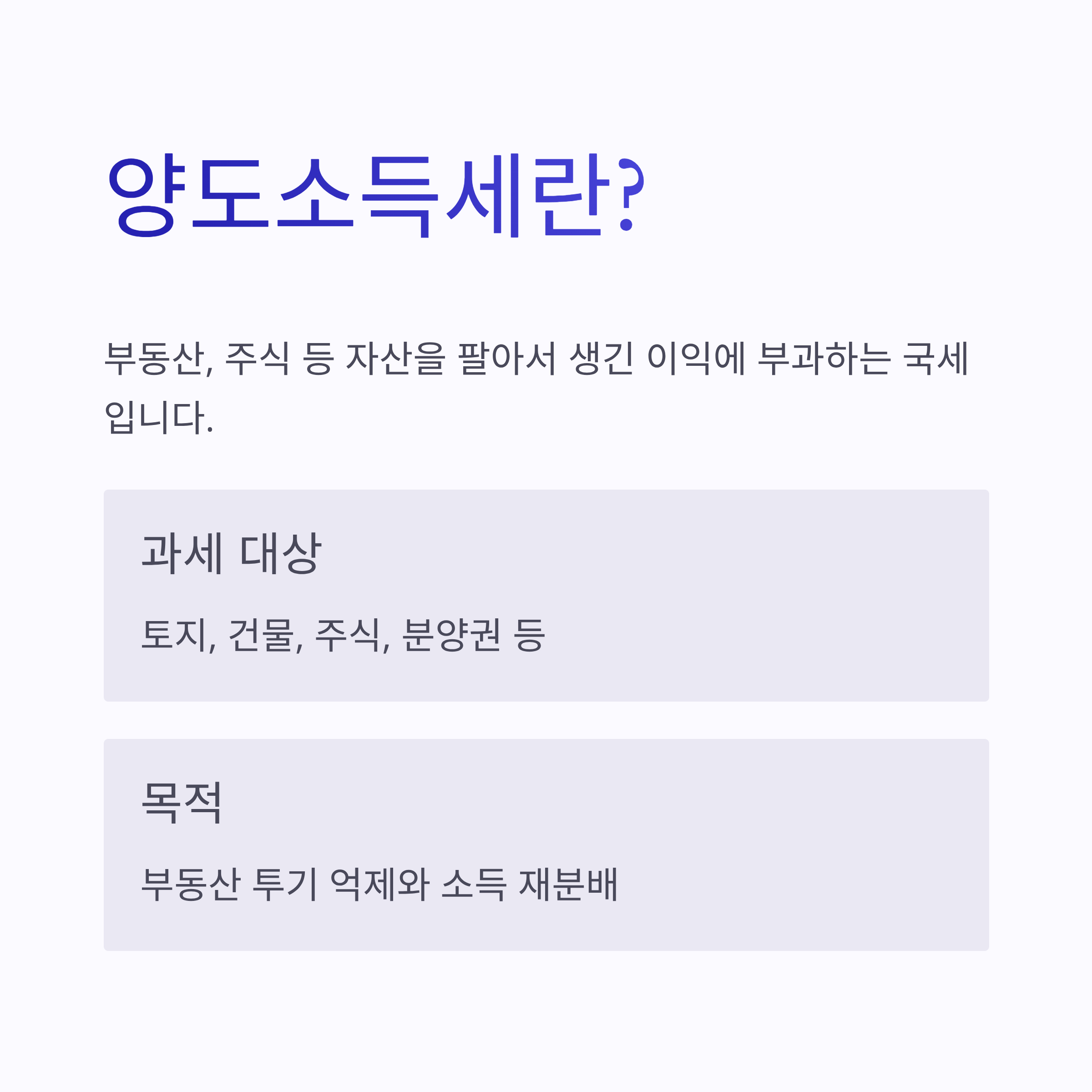 양도소득세는 개인이 토지, 건물 등 부동산이나 주식, 분양권 등 자산을 유상으로 양도(매매 등)하여 발생하는 이익(양도차익)에 대해 과세하는 국세입니다. 즉, 자산을 팔아 생긴 이익에 부과하는 세금으로, 부동산 시장의 투기 억제와 소득 재분배를 목적으로 도입된 대표적인 세목입니다.
