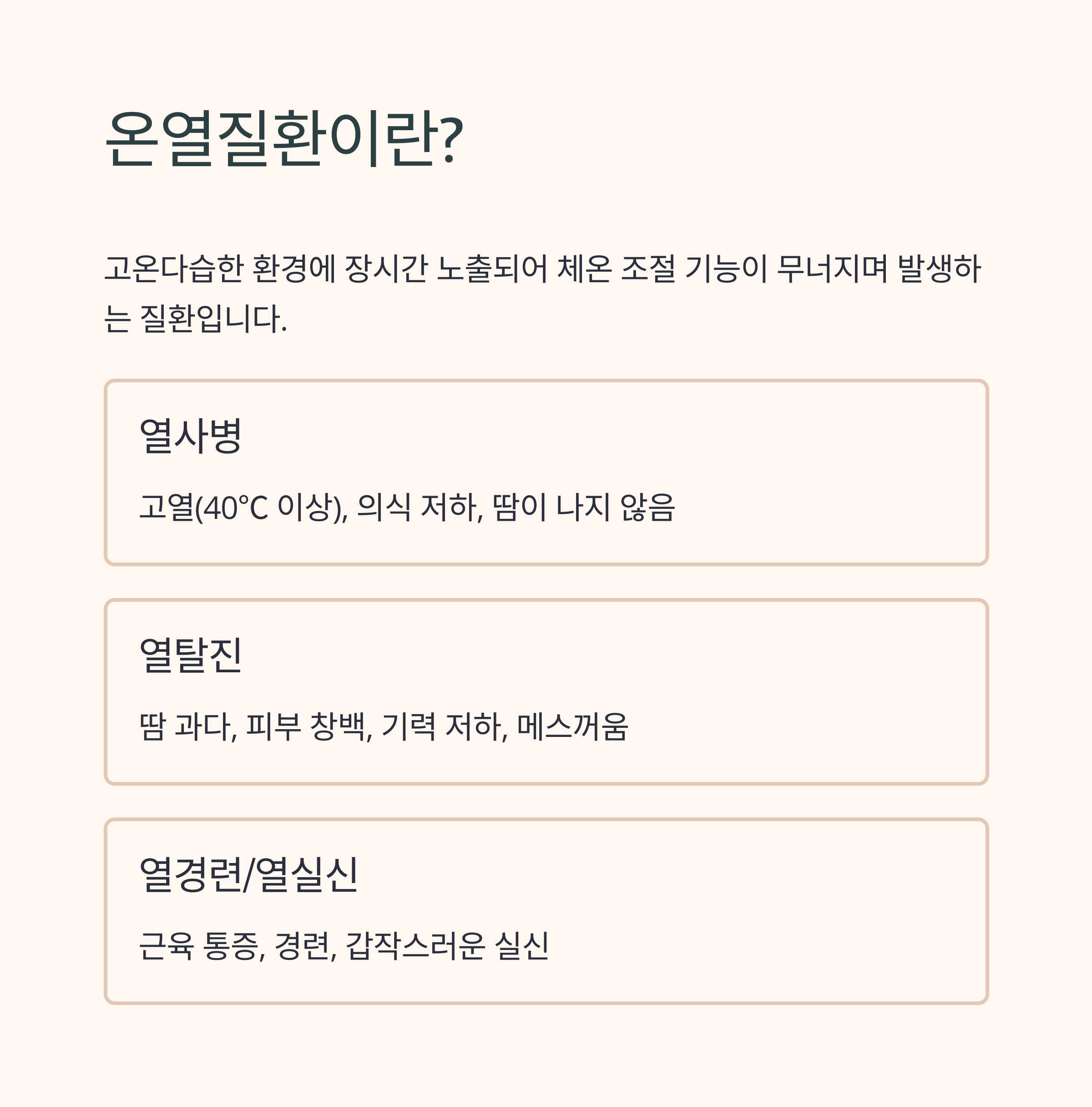온열질환은 고온다습한 환경에 신체가 장시간 노출되면서 체온 조절 기능이 무너지며 발생하는 질환입니다.