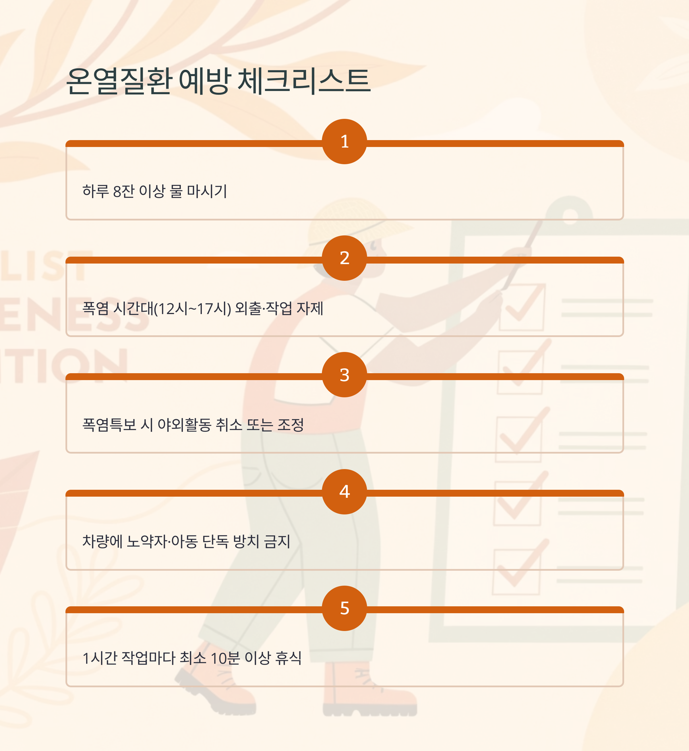 이 글에서는 온열질환의 정의와 증상, 그리고 질병관리청이 제시한 예방 3대 수칙을 중심으로 실생활에서 실천할 수 있는 방법을 정리했습니다.