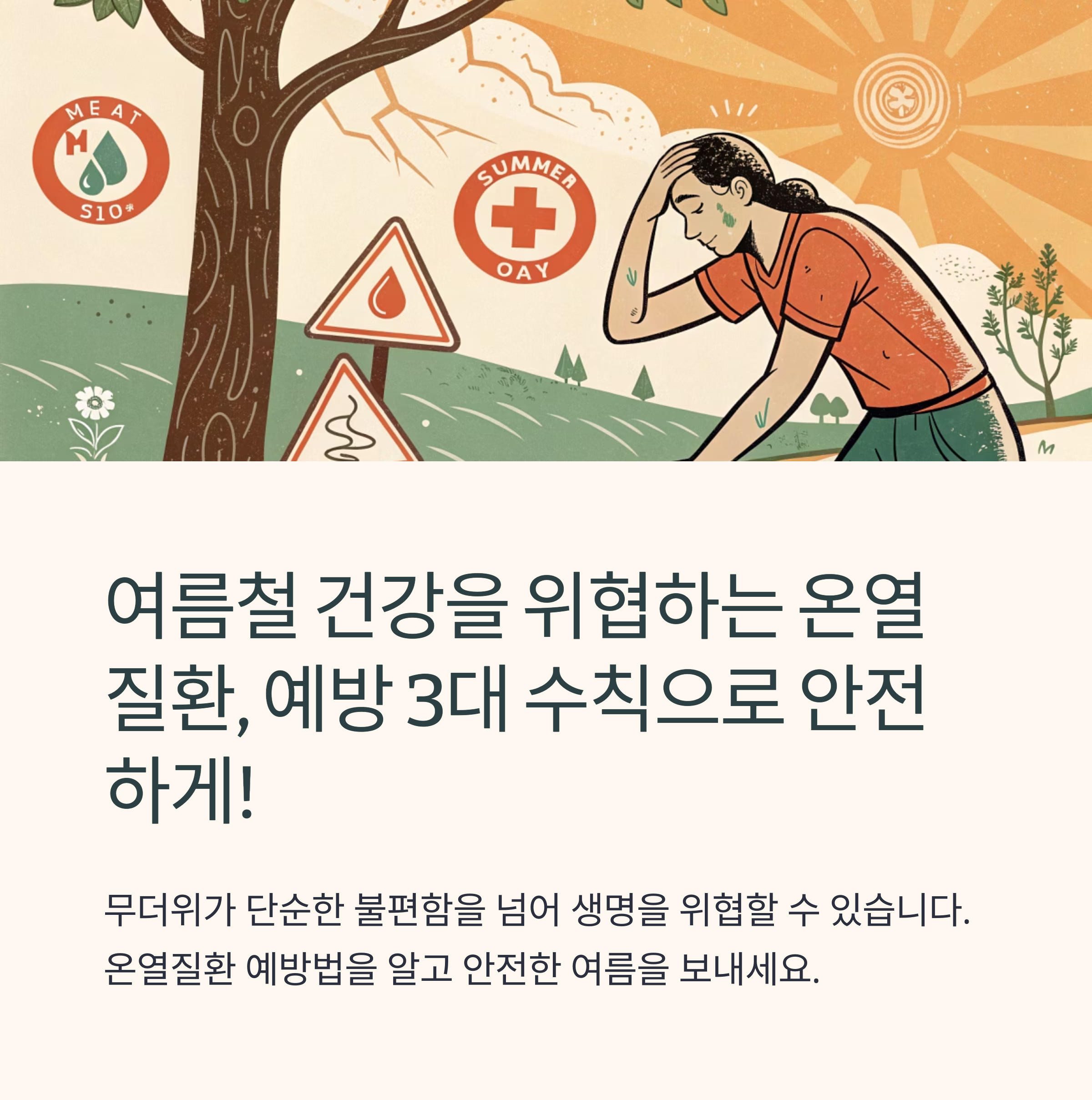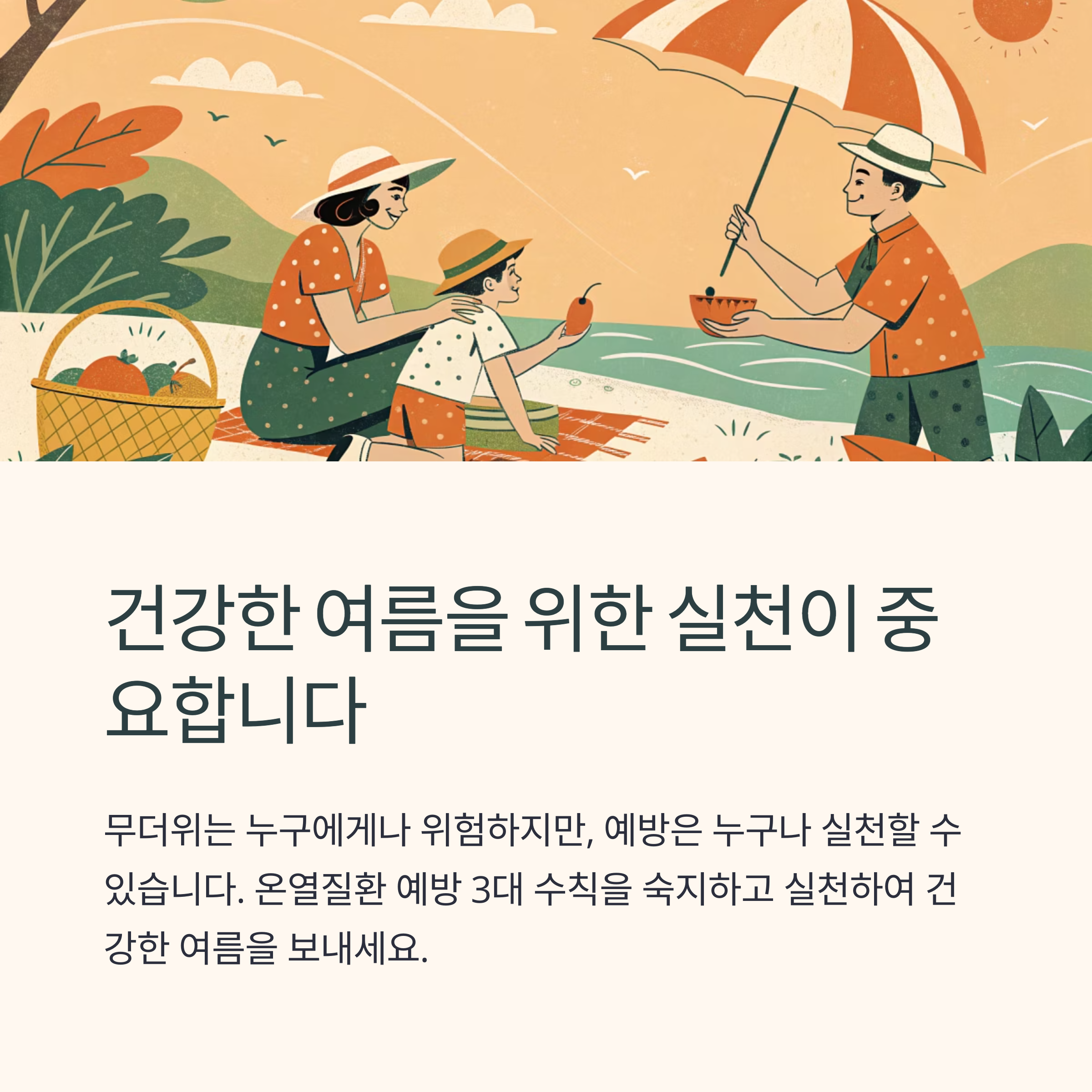 온열질환 예방 3대 수칙을 숙지하고 실천한다면, 더위 속에서도 건강하고 안전한 여름을 보낼 수 있습니다.