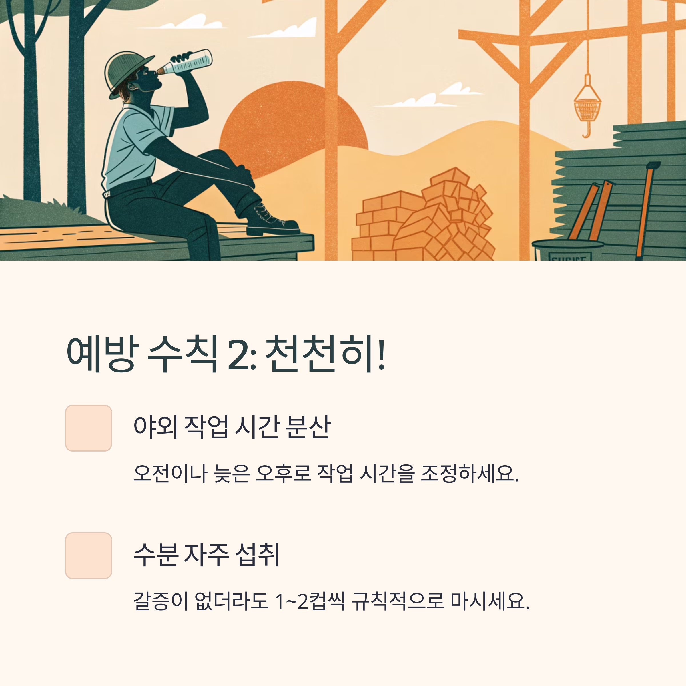 - 야외 작업은 오전 또는 늦은 오후로 분산