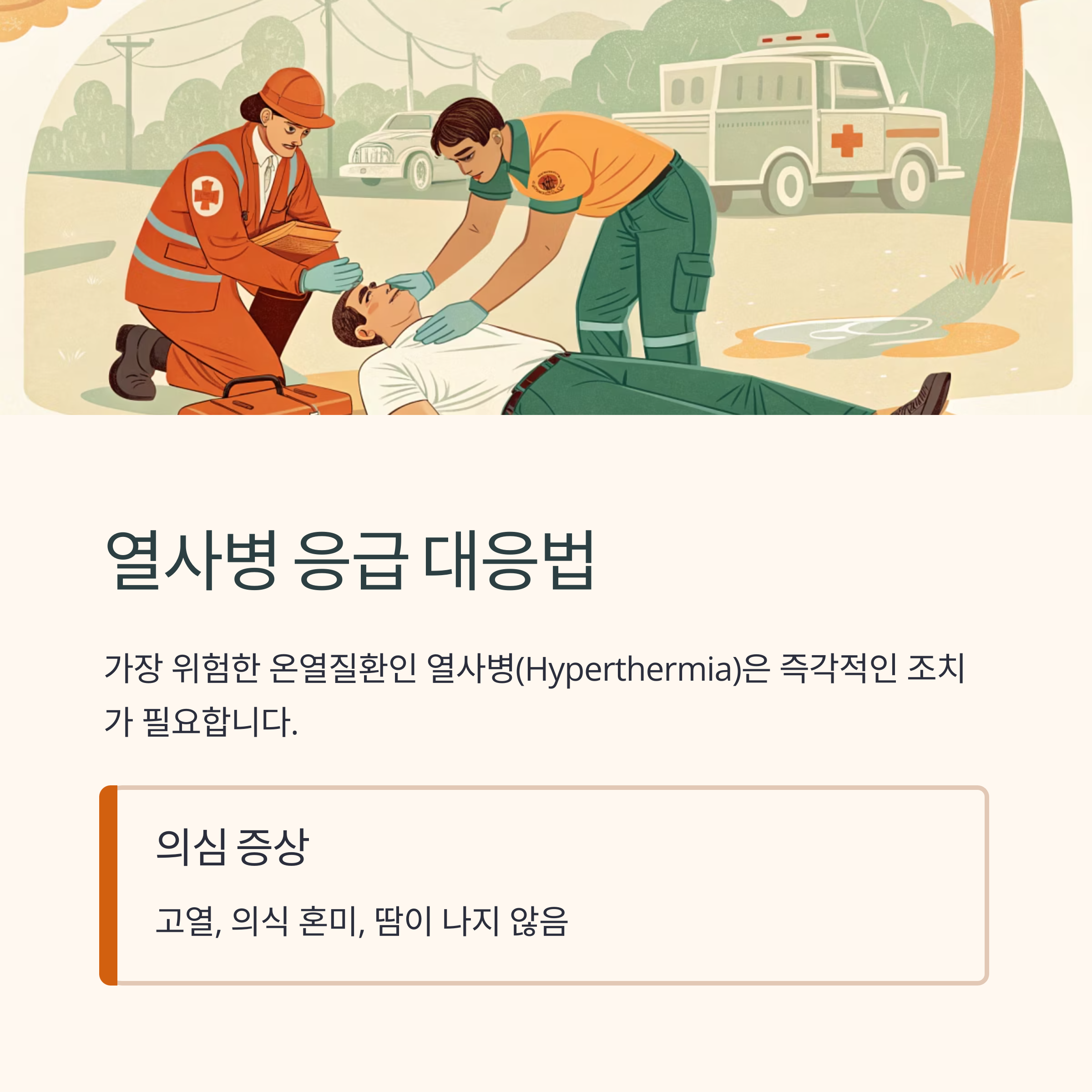 가장 위험한 온열질환인 "열사병(Hyperthermia)"은 즉각적인 조치가 필요합니다.