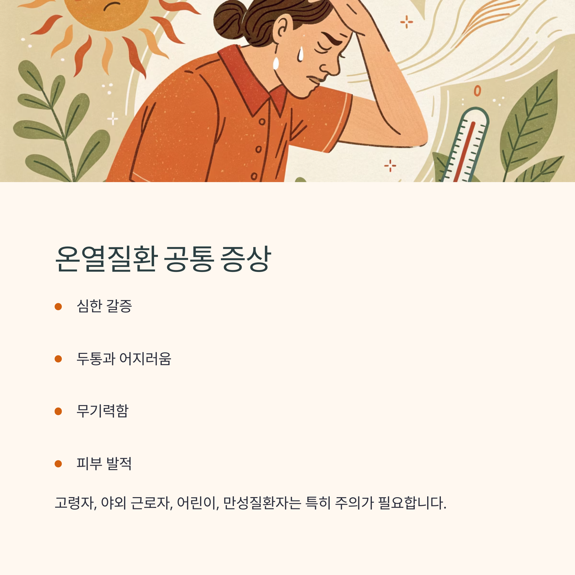 대표 질환으로는 열사병, 열탈진, 열경련, 열실신 등이 있으며, 고령자나 야외 근로자, 어린이, 만성질환자는 특히 주의가 필요합니다.