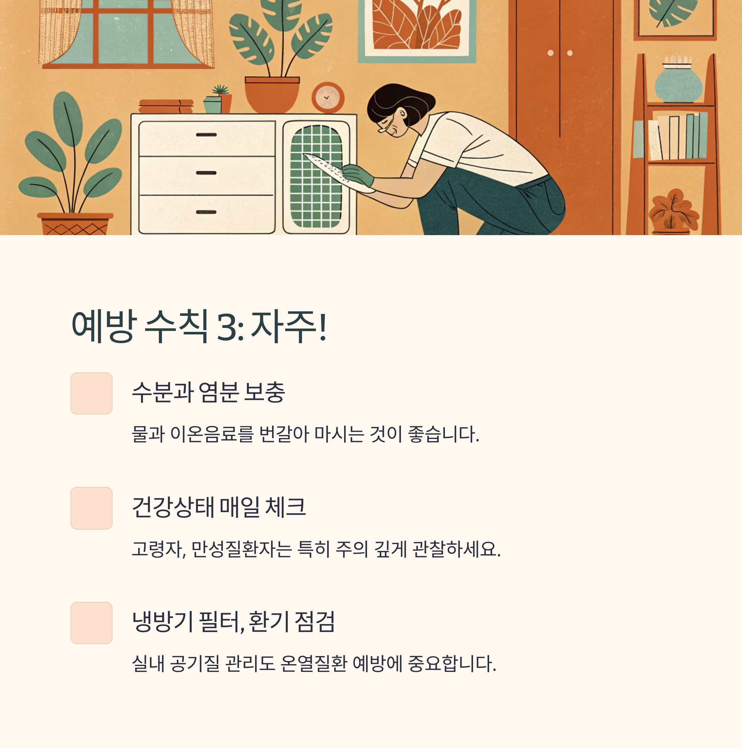 A2. 3대 수칙 외에도 하루 8잔 이상 수분 섭취, 기상 정보 확인 후 일정 조절, 폭염특보 시 활동 자제, 차량 내 방치 금지 등도 매우 중요합니다. 예방은 사소한 실천에서부터 시작되며, 상황에 맞게 유연하게 대응하는 것이 핵심입니다.