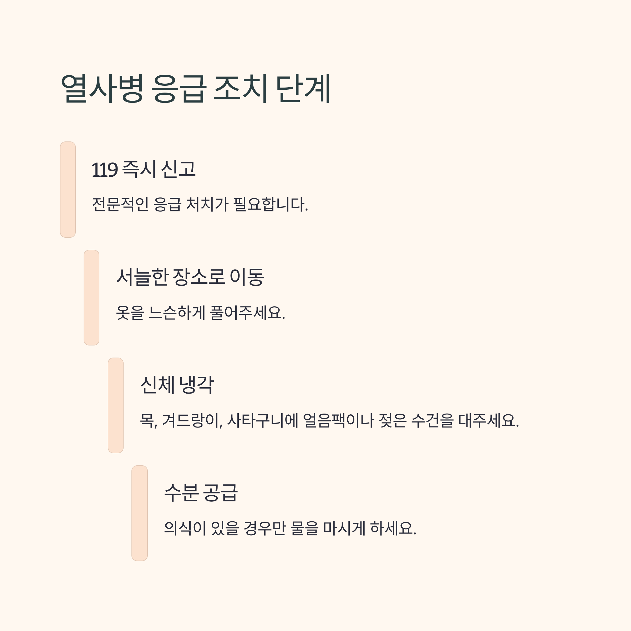 | 열사병 | 고열(40℃ 이상), 의식 저하, 땀이 나지 않음 |