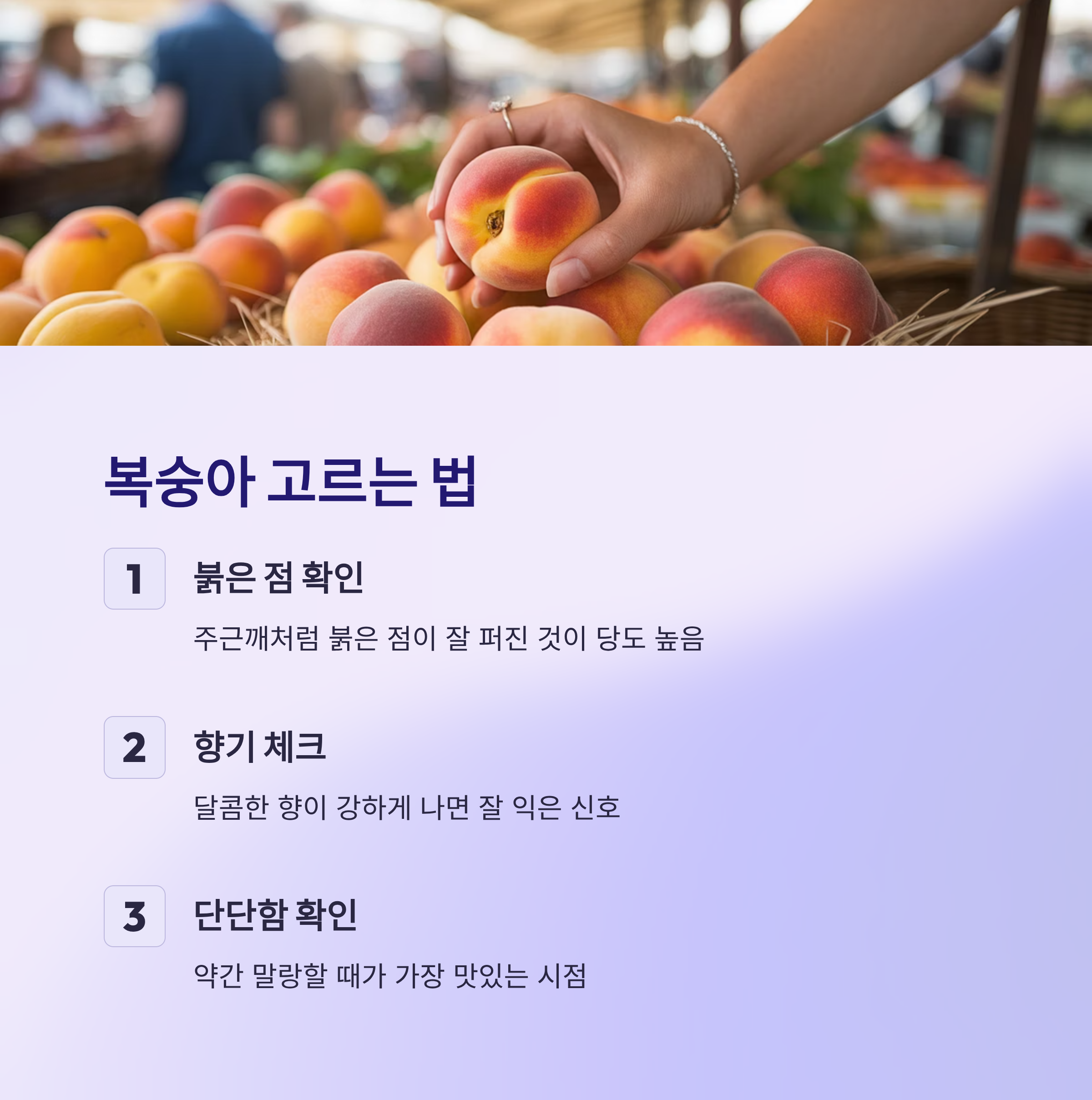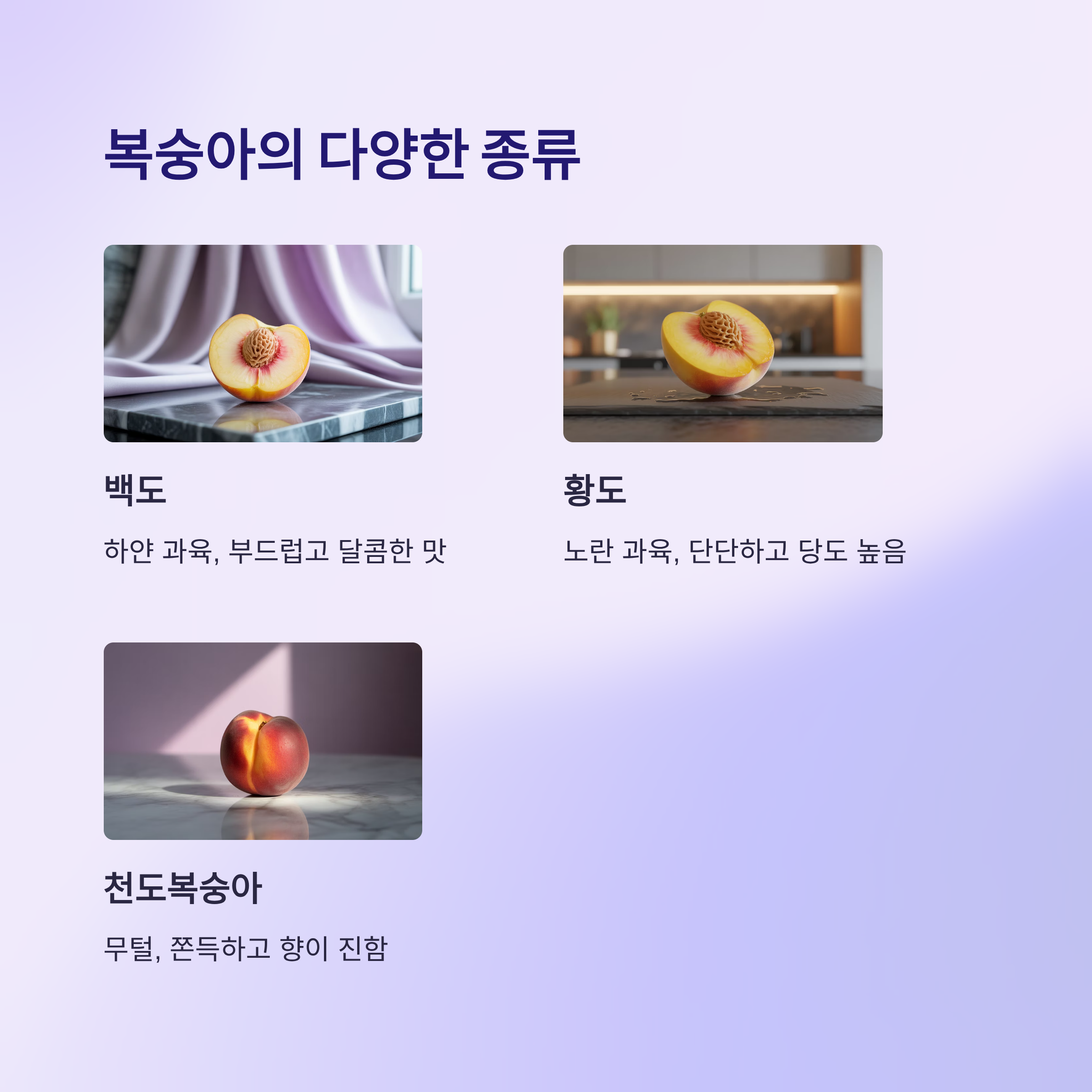 - 종류는 백도·황도·천도복숭아 등 다양, 아삭/말랑, 무털/유털로 쉽게 구분