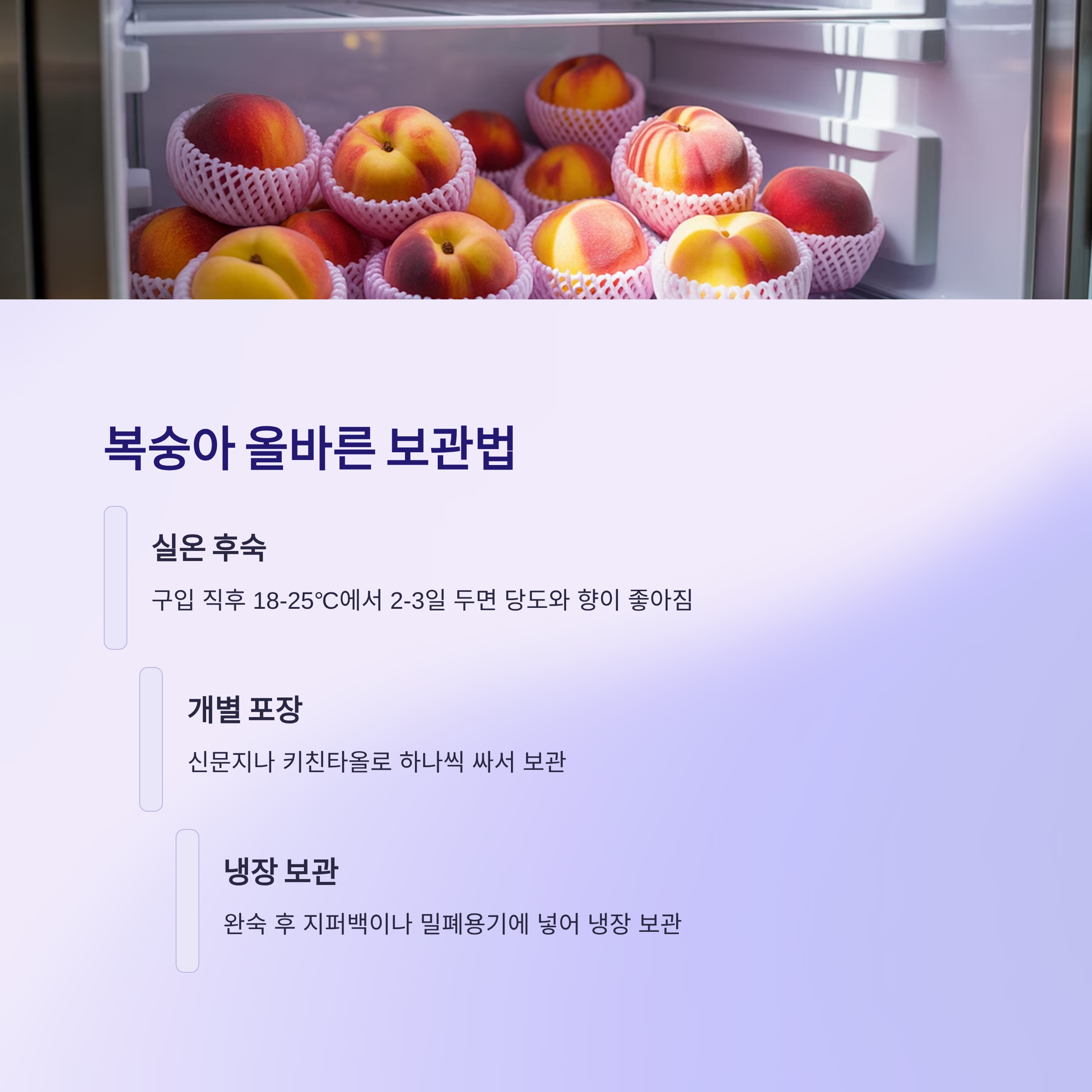- 실온 후숙: 복숭아는 수확 후에도 익어가는(후숙) 과일로, 구입 직후 실온(18~25℃)에서 2~3일 정도 두면 당도와 향이 좋아집니다. 단, 집안 온도가 높을 땐 서늘한 곳(8~13℃)에서 1~2일 보관.