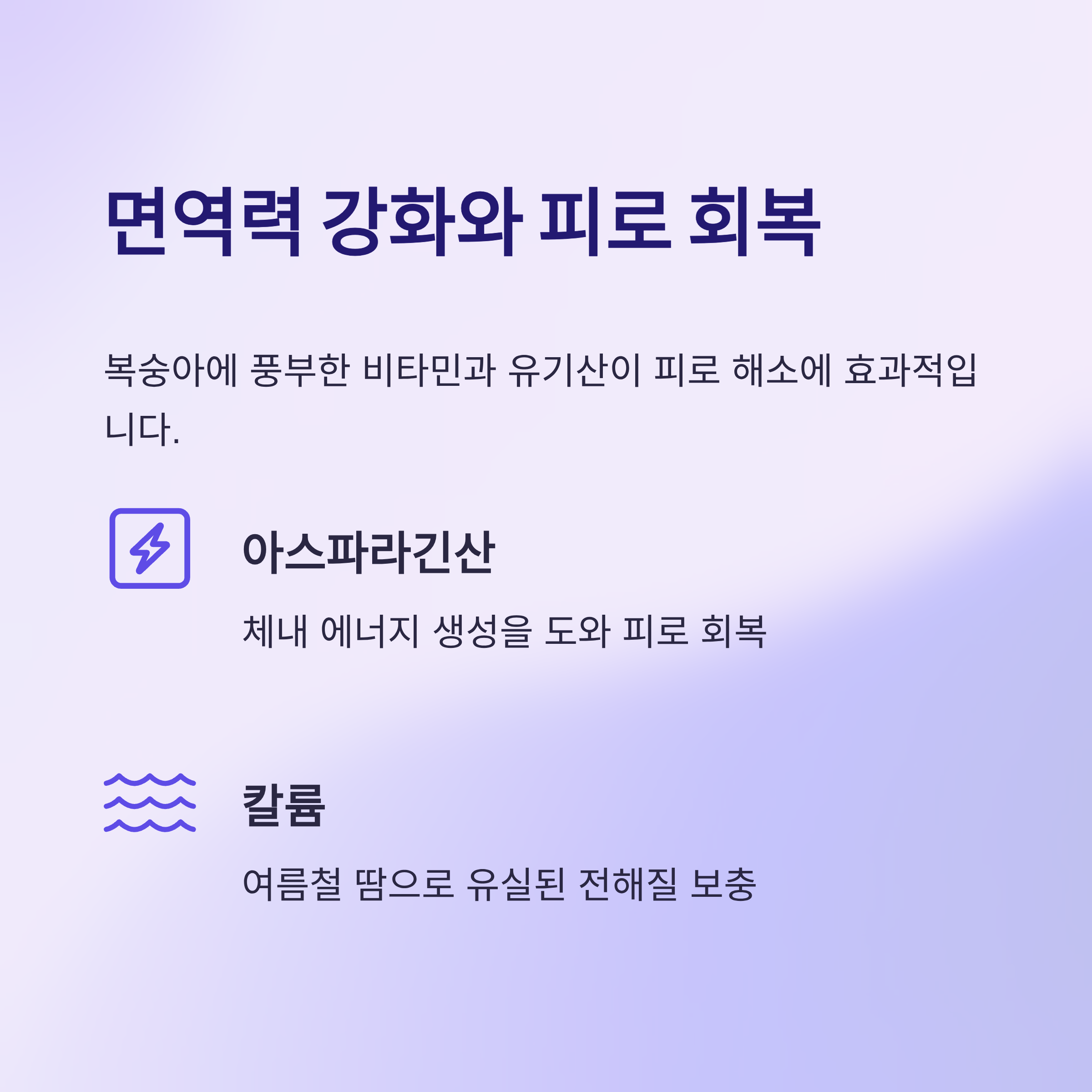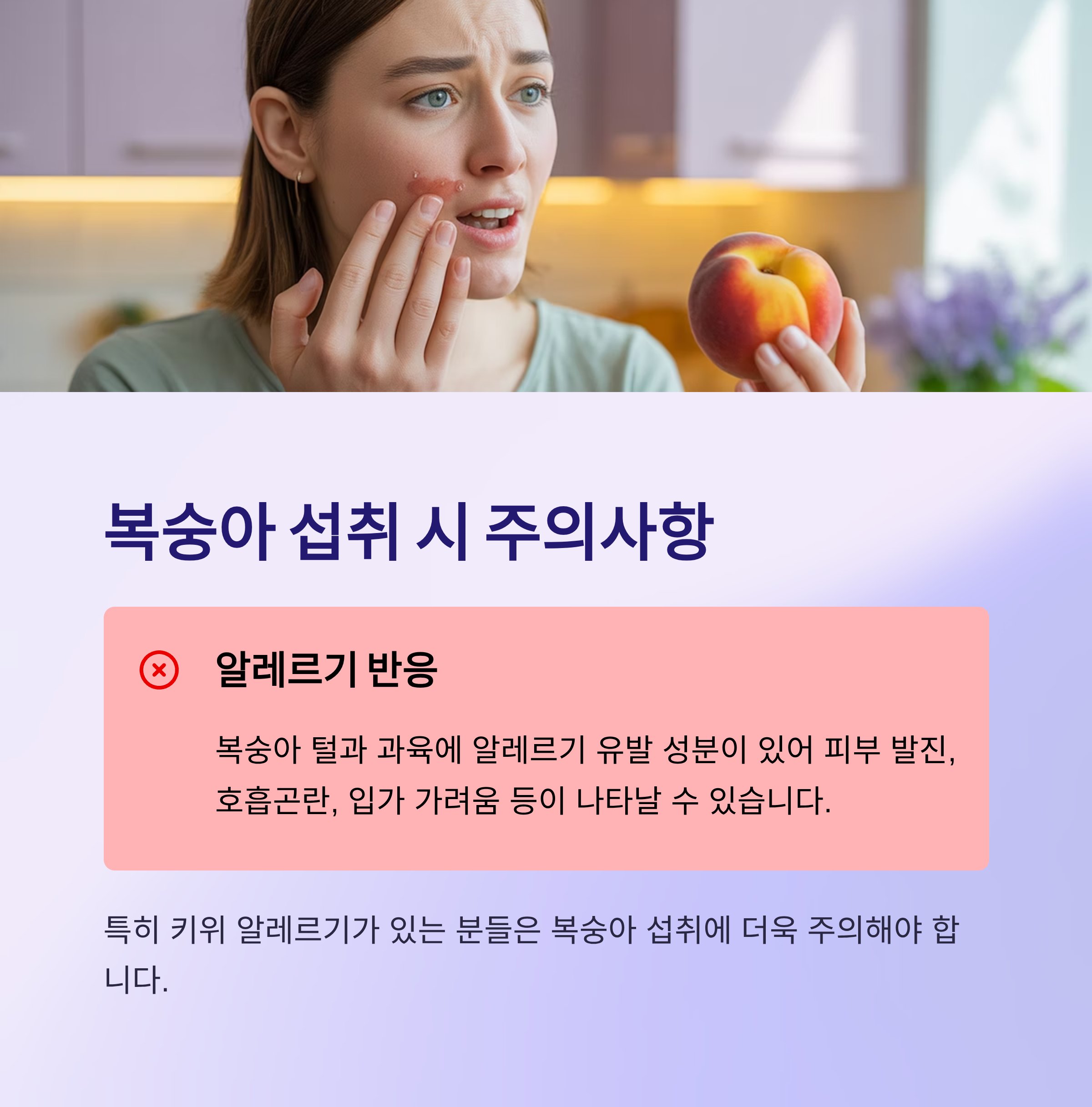 - 부작용은 알레르기(특히 껍질, 과즙), 과다 섭취 시 위장장애, 복숭아와 상극 음식 주의 필요!