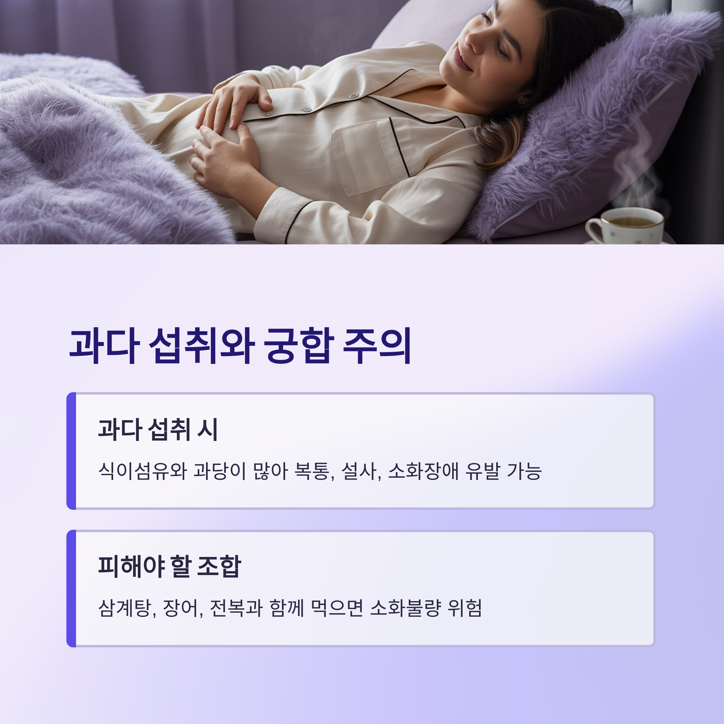 - 궁합 주의 음식: 삼계탕, 장어, 전복 등과의 동시 섭취는 소화불량·복통을 유발할 수 있으니 피하는 것이 좋습니다.