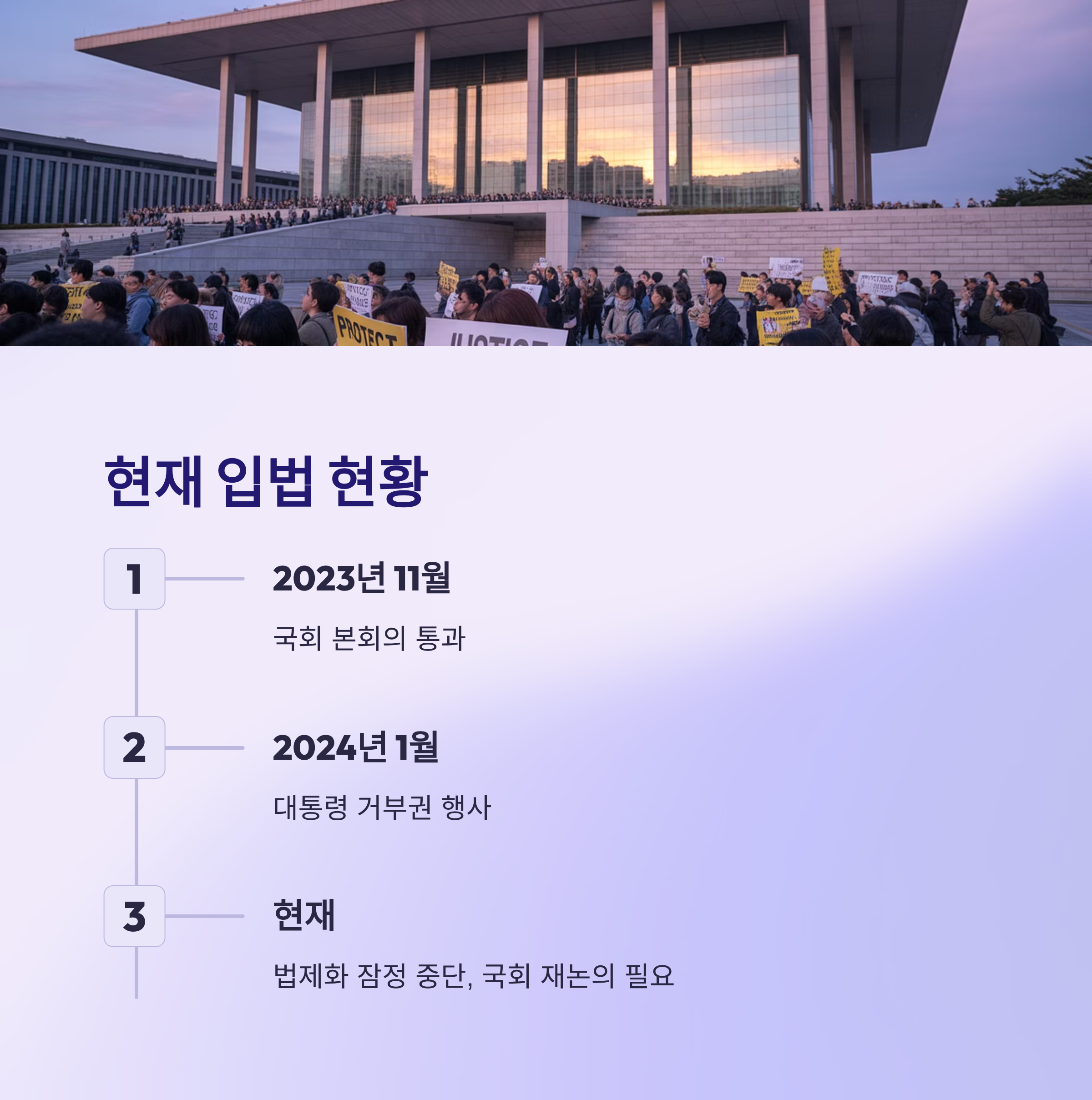 제22대 국회(2022~2024년)에서 국회 본회의를 통과(2023년 11월)했지만, 2024년 1월 대통령의 “거부권” 행사로 법제화가 잠정 중단된 상황입니다.