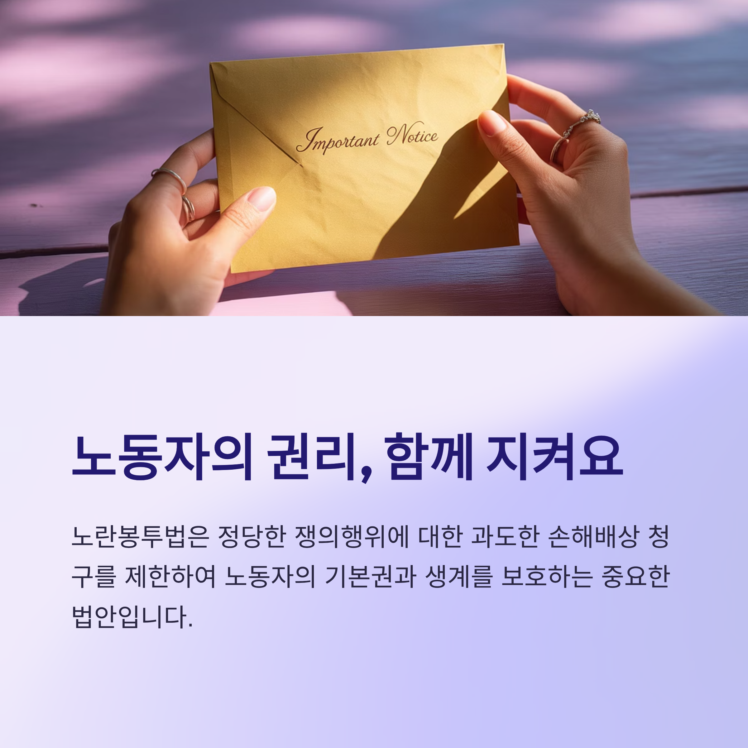 - 이 법은 직장 내 노조 활동과 집단 파업이 사회적 ‘생존권’의 문제임을 확인하고, 과잉 손배소를 제한해 노동 기본권 보호에 방점을 둡니다.