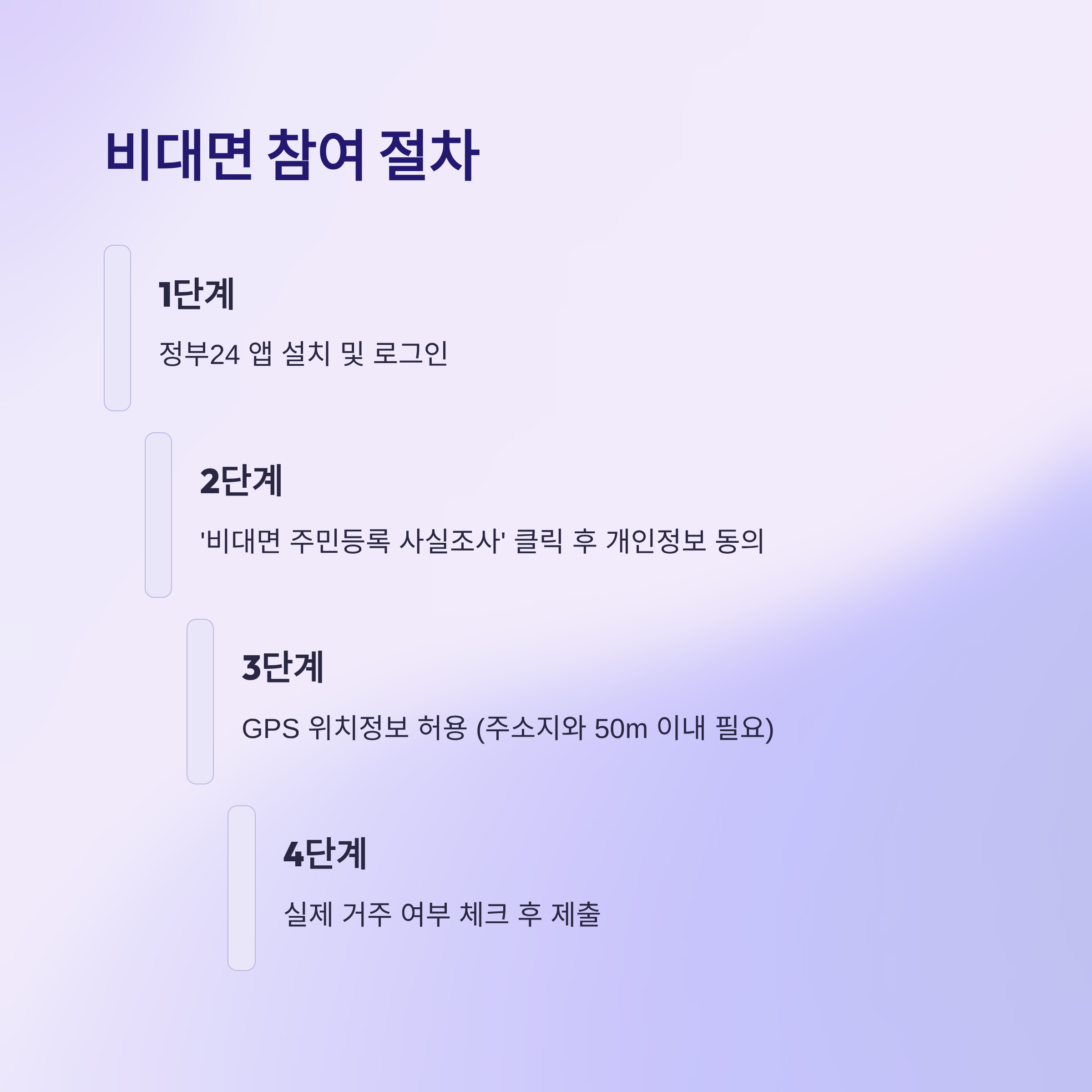 A4. 가장 간편한 주민등록 사실조사 방법은 정부24 앱을 활용한 비대면 참여입니다. 앱 설치 후 본인 인증과 GPS 위치 확인을 통해 거주지 일치 여부를 확인하면 5분 내에 완료할 수 있습니다.