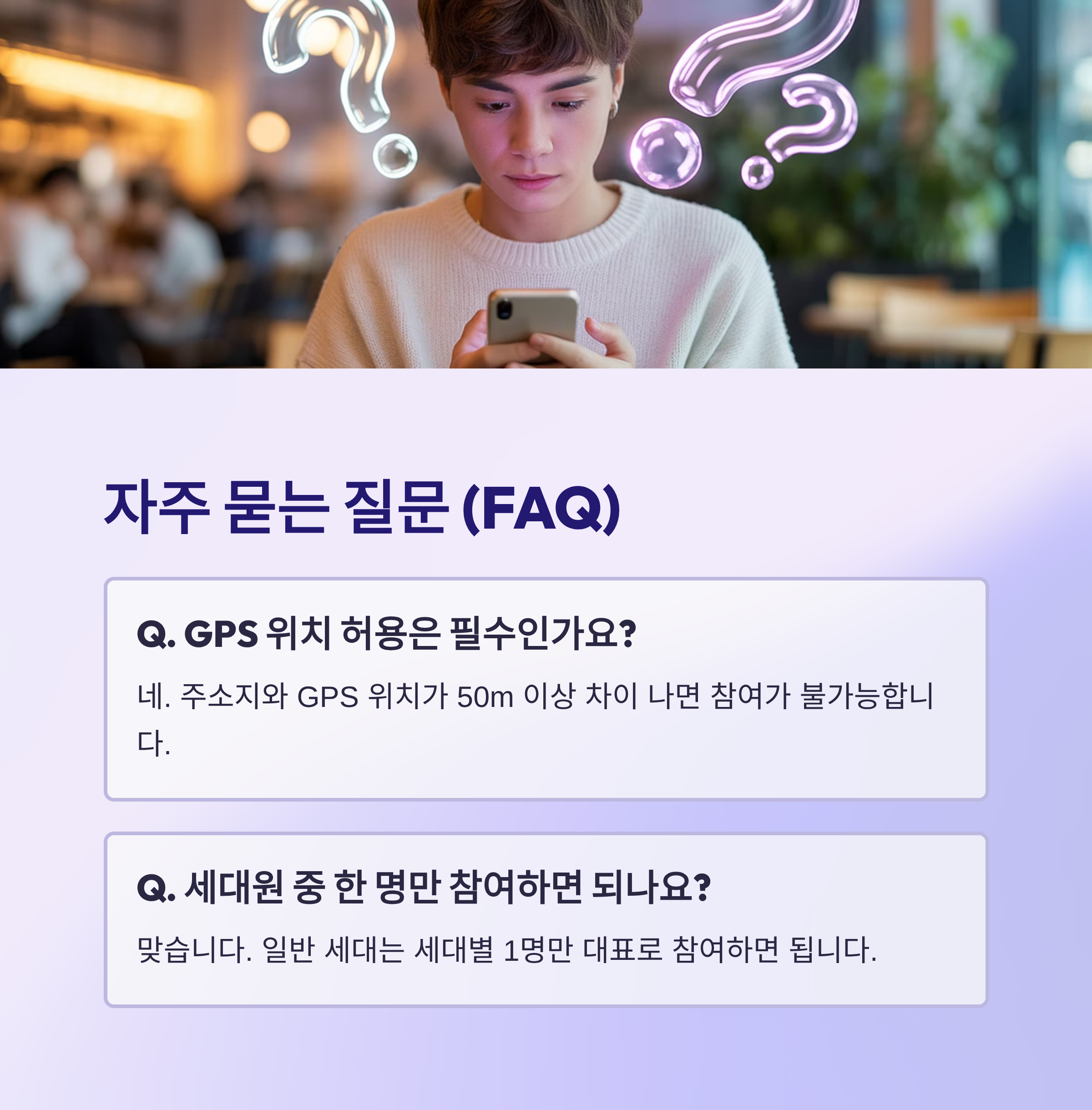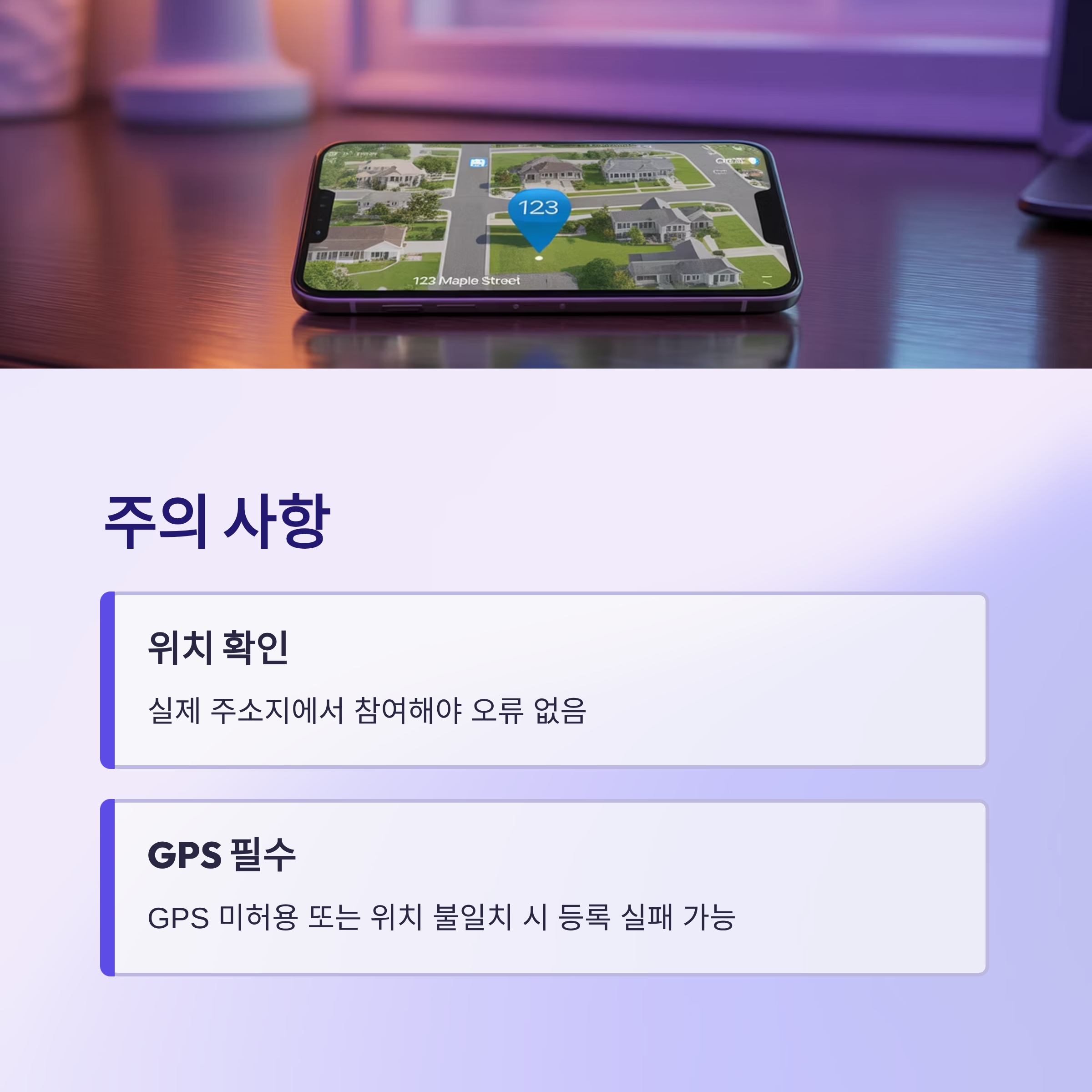 A1. 네. 주소지와 GPS 위치가 50m 이상 차이 나면 참여가 불가능하므로, 반드시 위치정보를 허용하고 실제 거주지에서 진행해야 합니다.