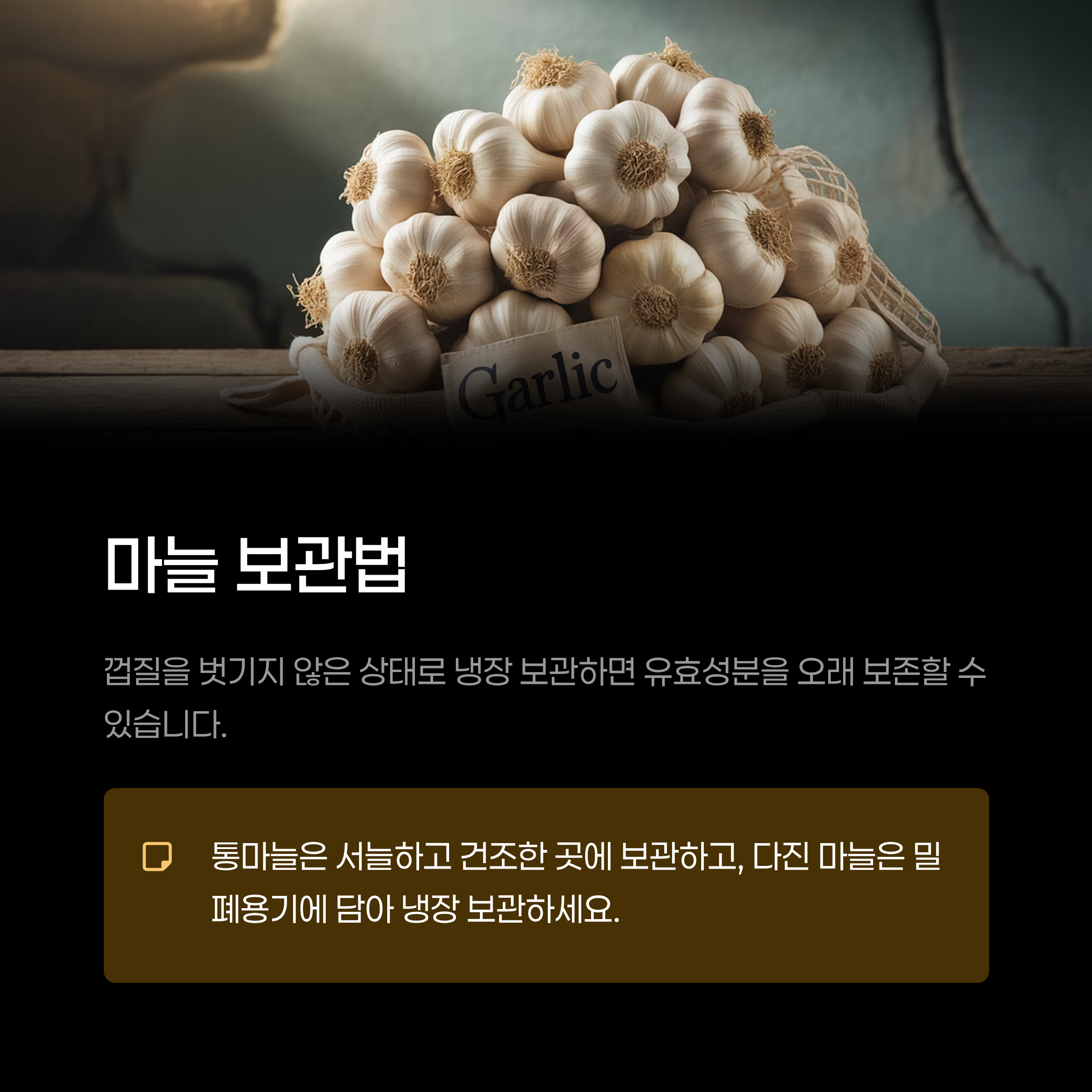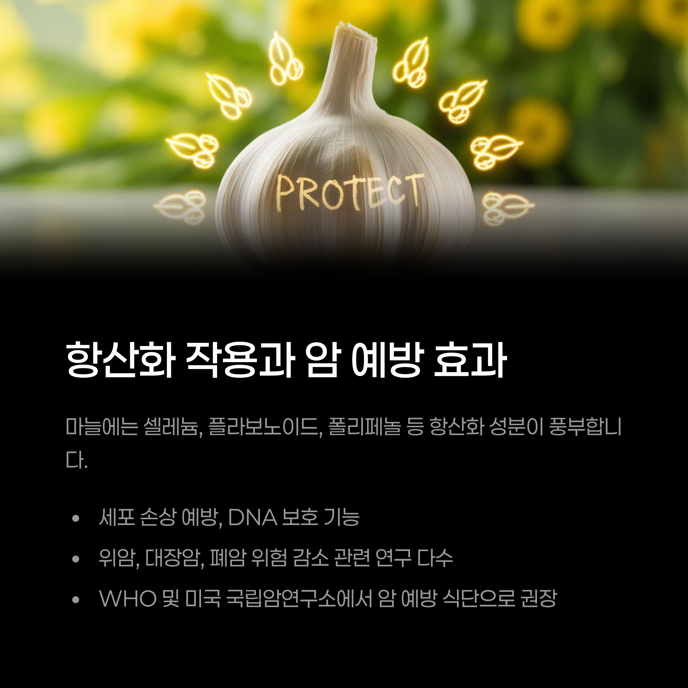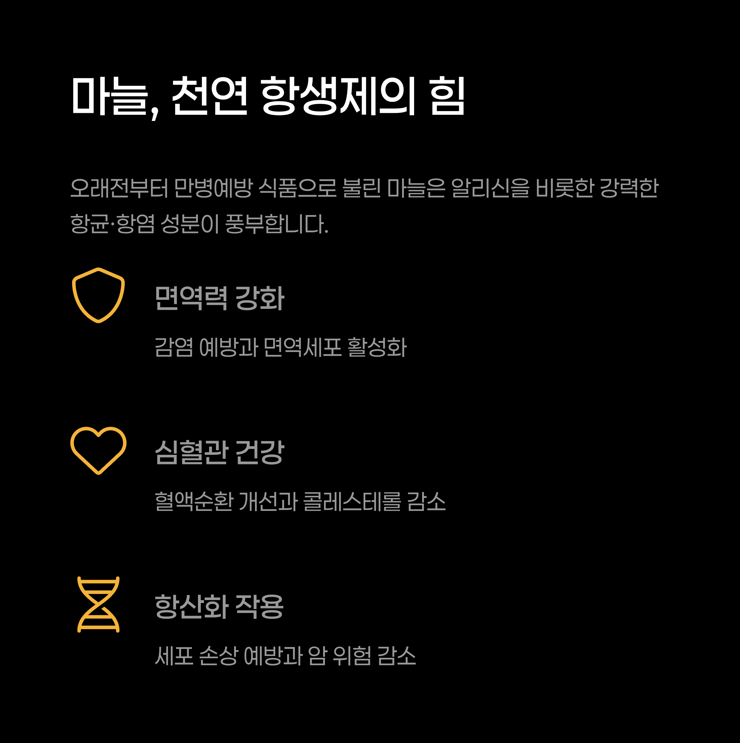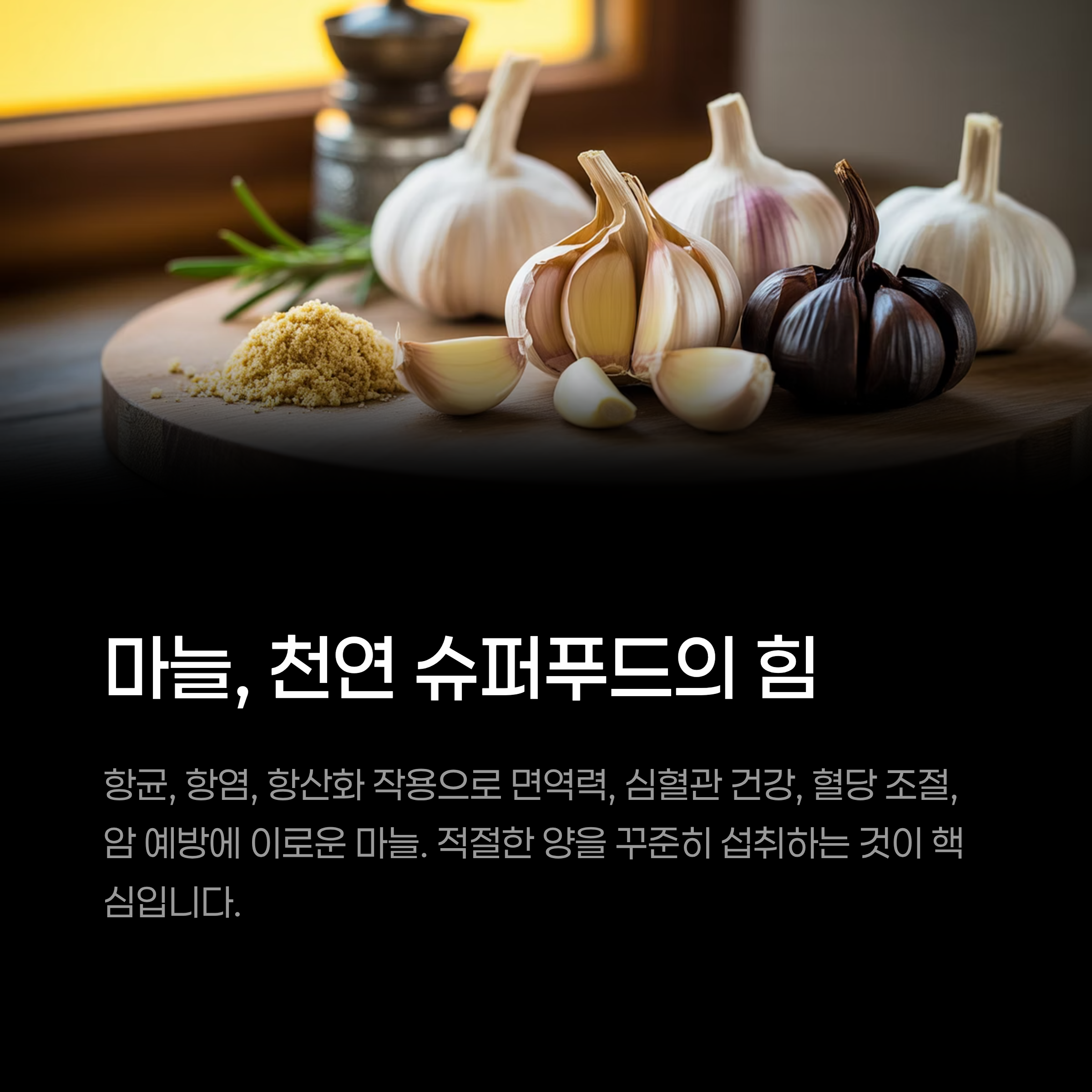 마늘은 항균, 항염, 항산화 작용으로 면역력, 심혈관 건강, 혈당 조절, 암 예방에 이로운 슈퍼푸드입니다.