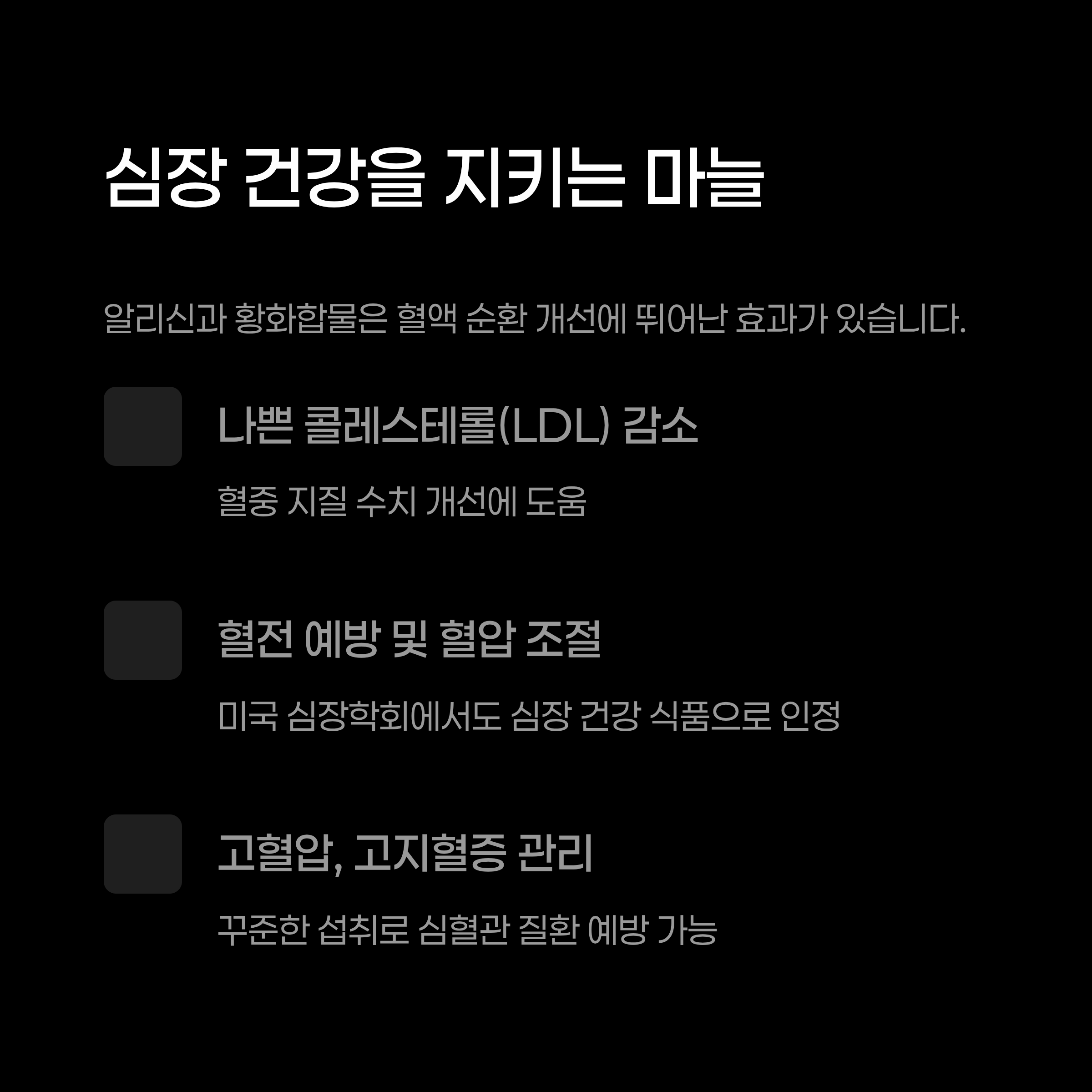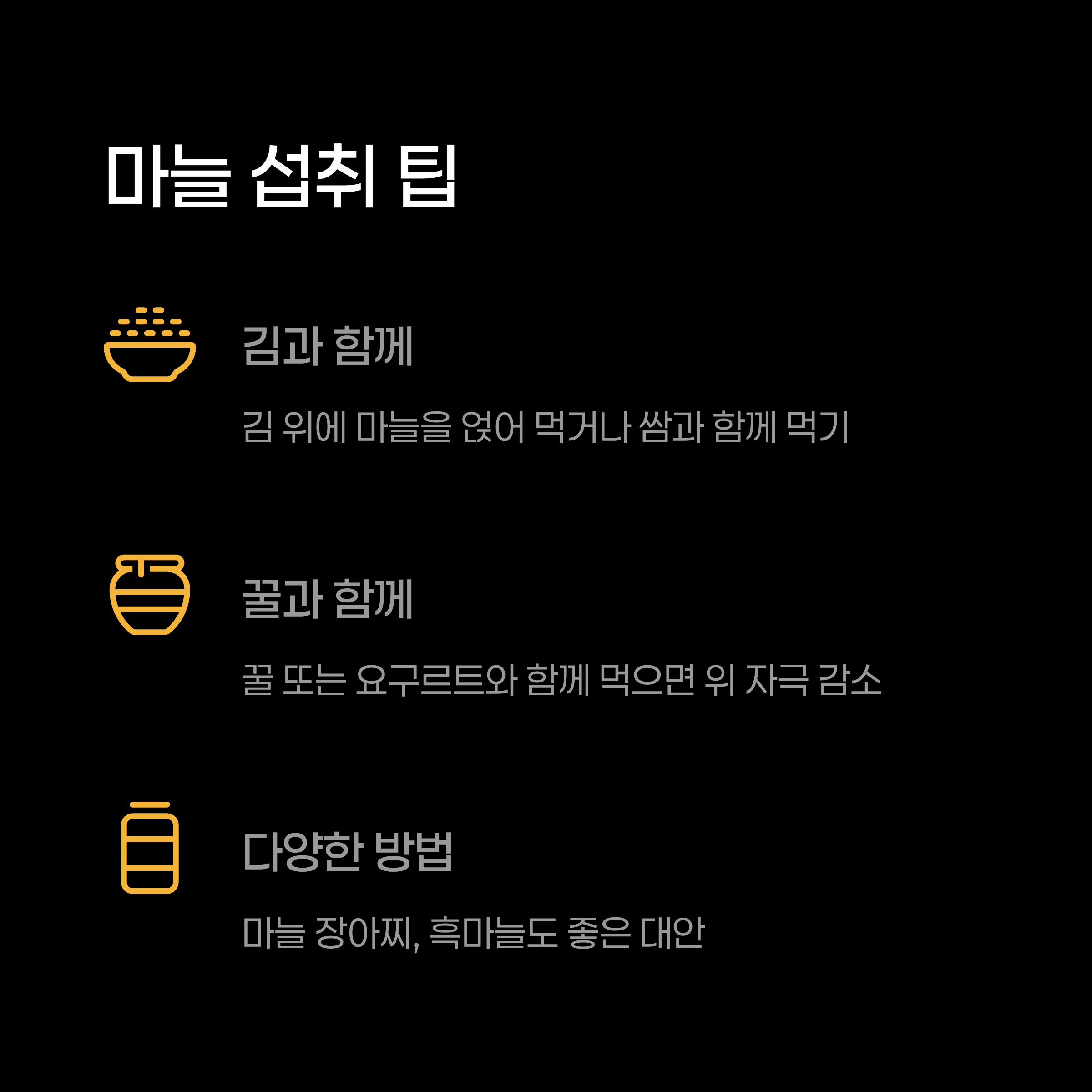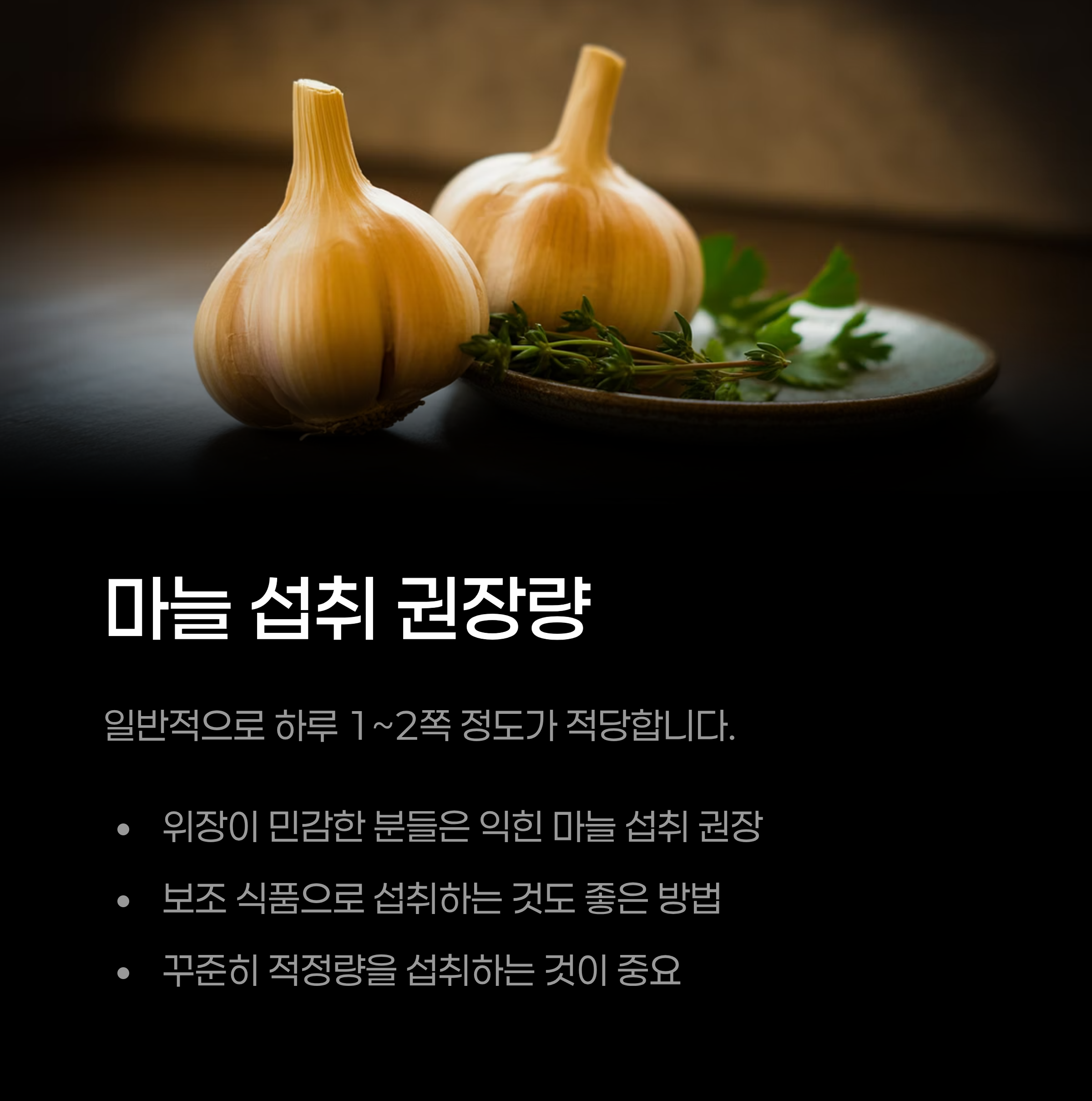 - 위장 민감한 분들은 익힌 마늘 또는 보조 식품으로 섭취 고려