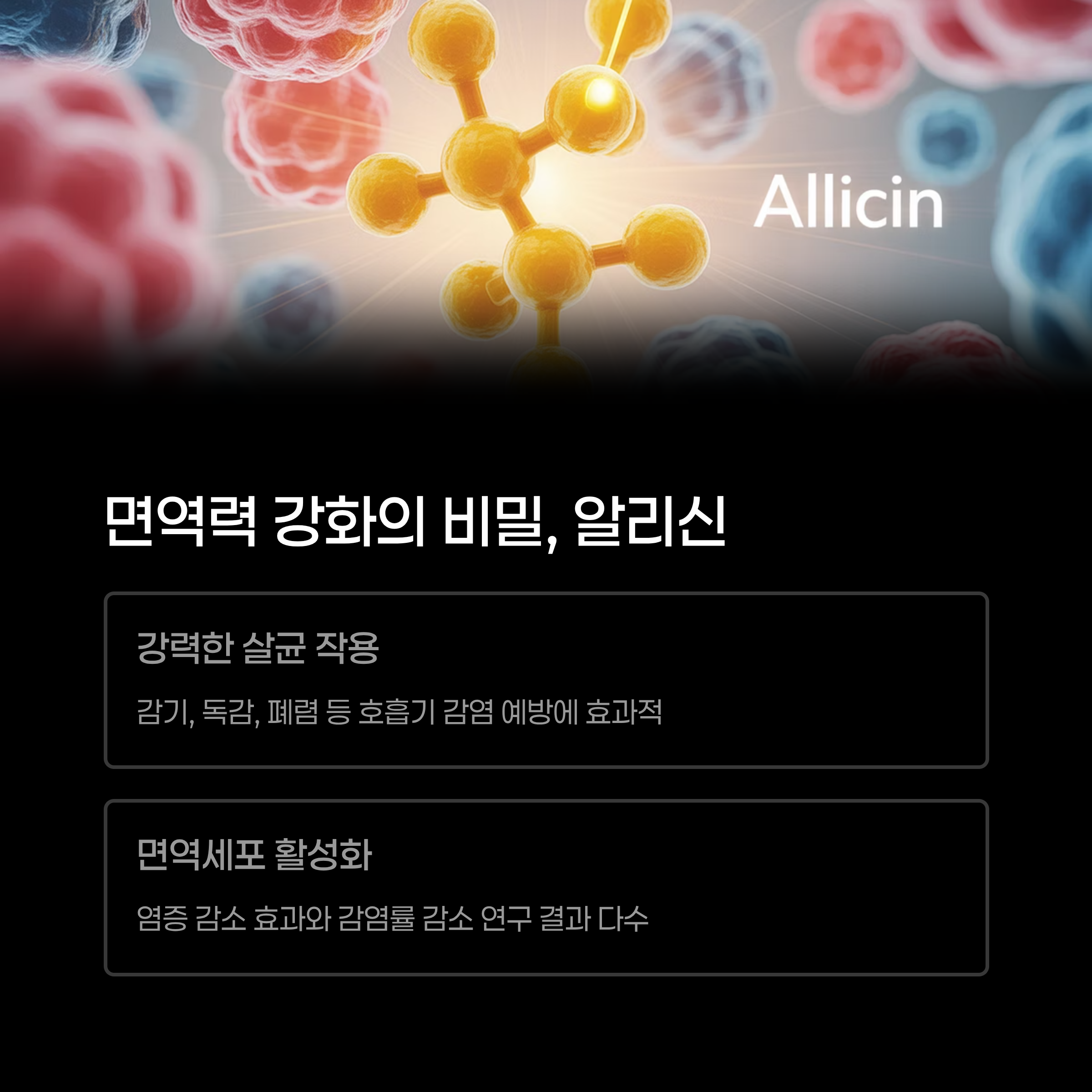 마늘의 핵심 성분인 "알리신(Allicin)"은 강력한 살균 작용으로 알려져 있습니다.