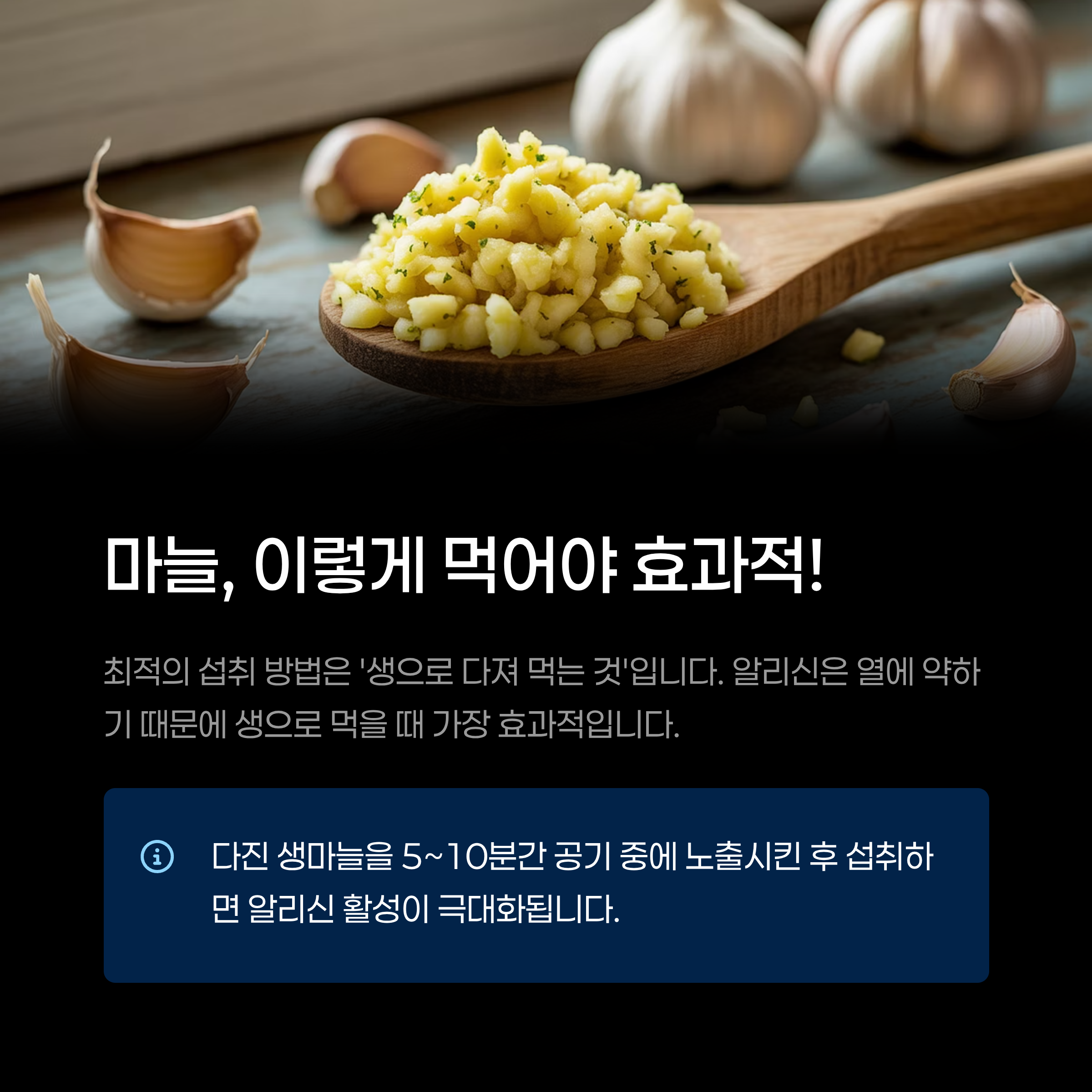 - 다진 생마늘을 5~10분간 노출 후 섭취 → 알리신 활성 극대화