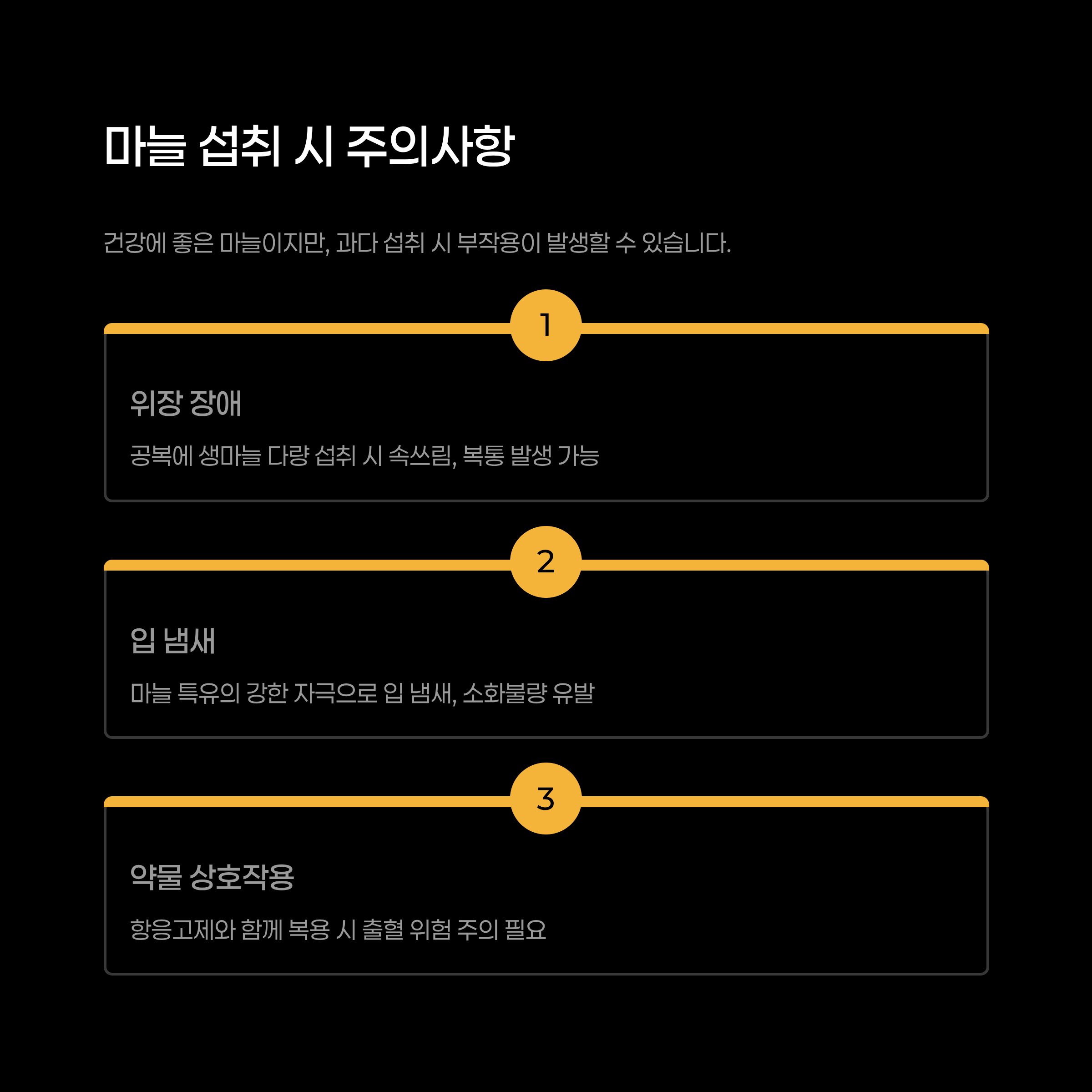 마늘은 건강에 좋은 식품이지만, 과다 섭취 시 부작용이 발생할 수 있습니다.