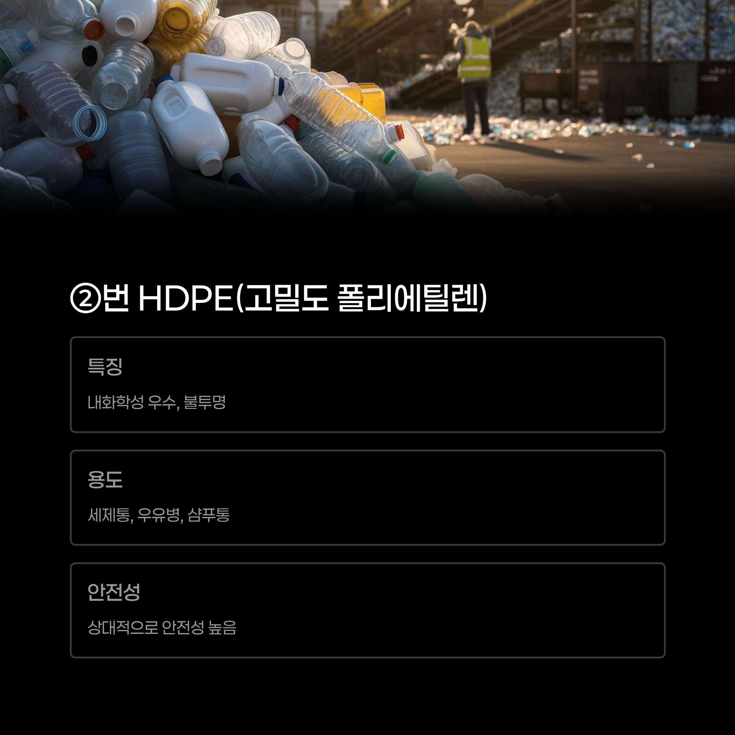 | ②번 | HDPE | 우유통, 세제용기 | 재활용 가능 | 상대적 안전성 높음 |
