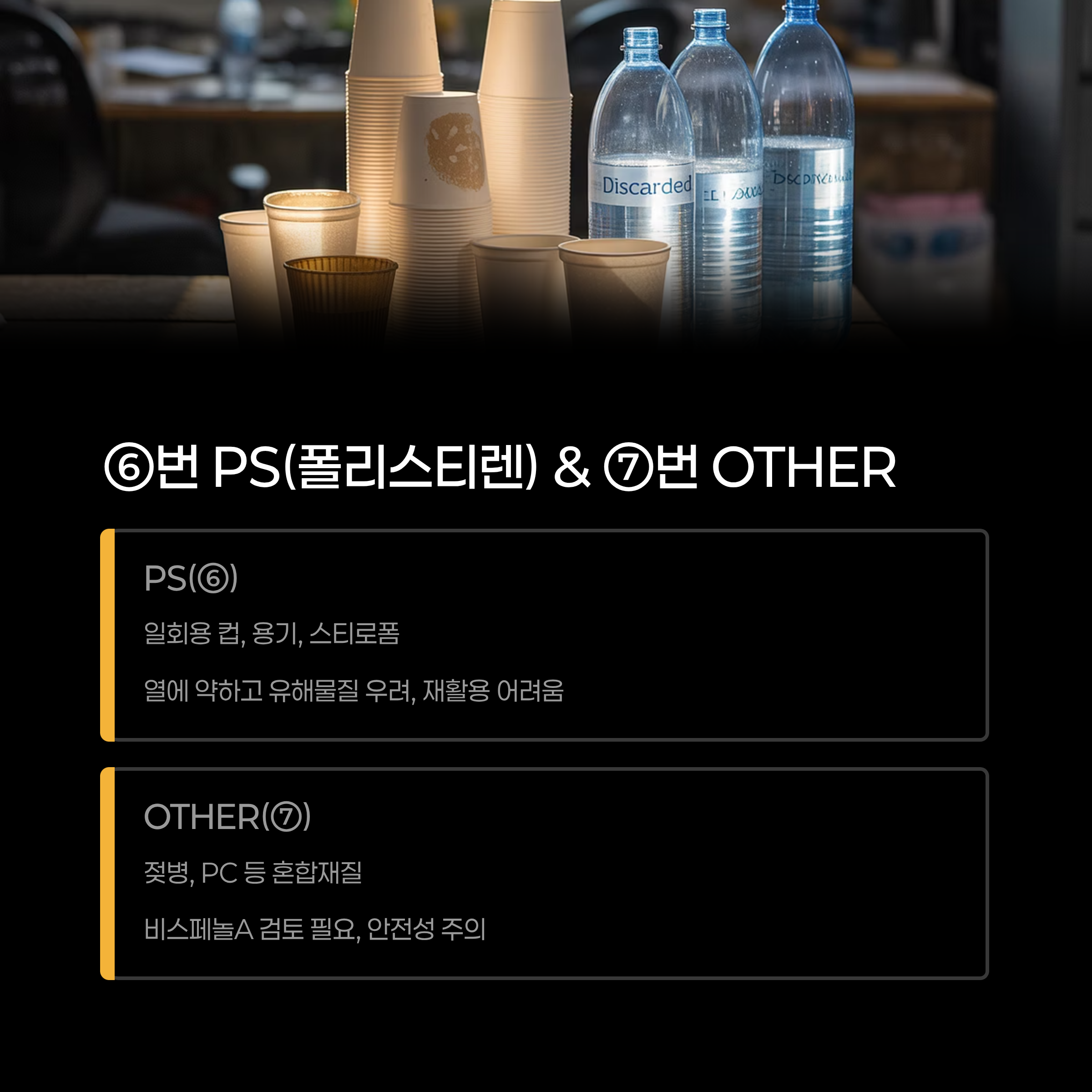 | ⑥번 | PS | 일회용 컵, 용기 | 재활용 어려움 | 열에 약하고 유해물질 우려 |